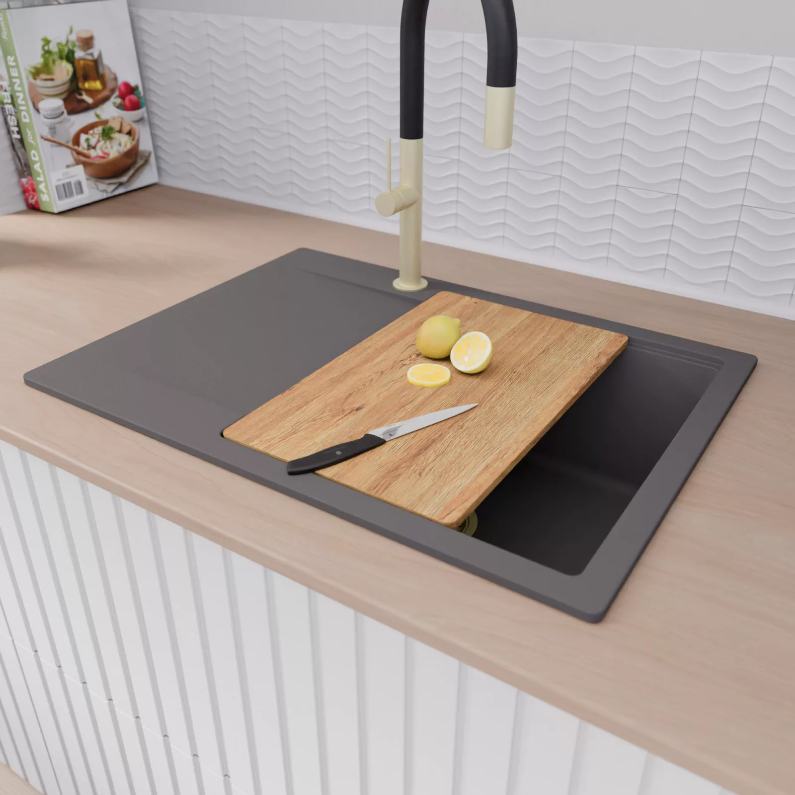 A mosogató prémium minőségű gránit kompozitból készült. Letisztult megjelenése mellett rendkívül praktikus, így bármilyen stílusú konyhába harmonikusan illeszkedik. A strapabíró gránit anyag hosszú távon is megbízható használatot garantál.