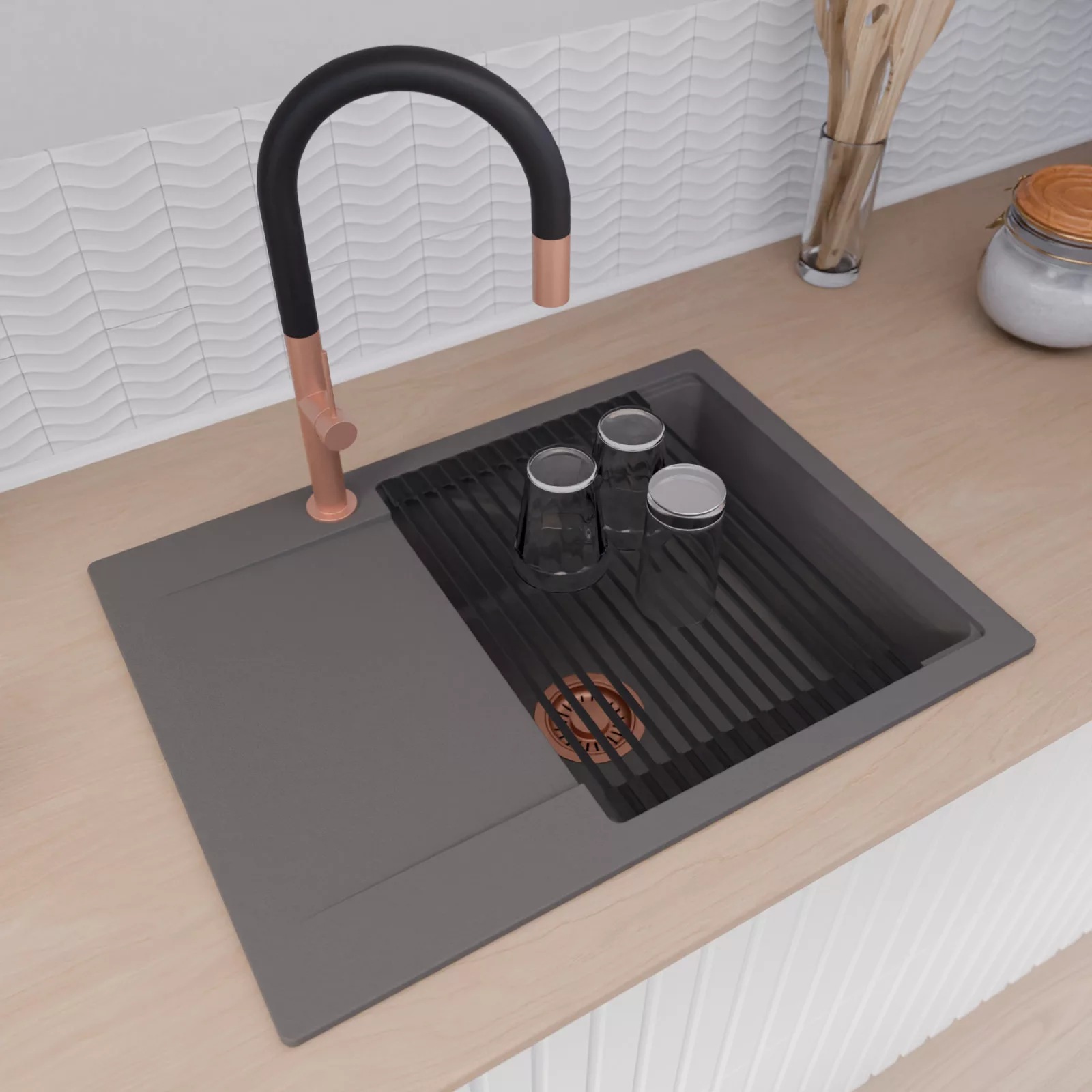 A mosogató prémium minőségű gránit kompozitból készült. Letisztult megjelenése mellett rendkívül praktikus, így bármilyen stílusú konyhába harmonikusan illeszkedik. A strapabíró gránit anyag hosszú távon is megbízható használatot garantál.