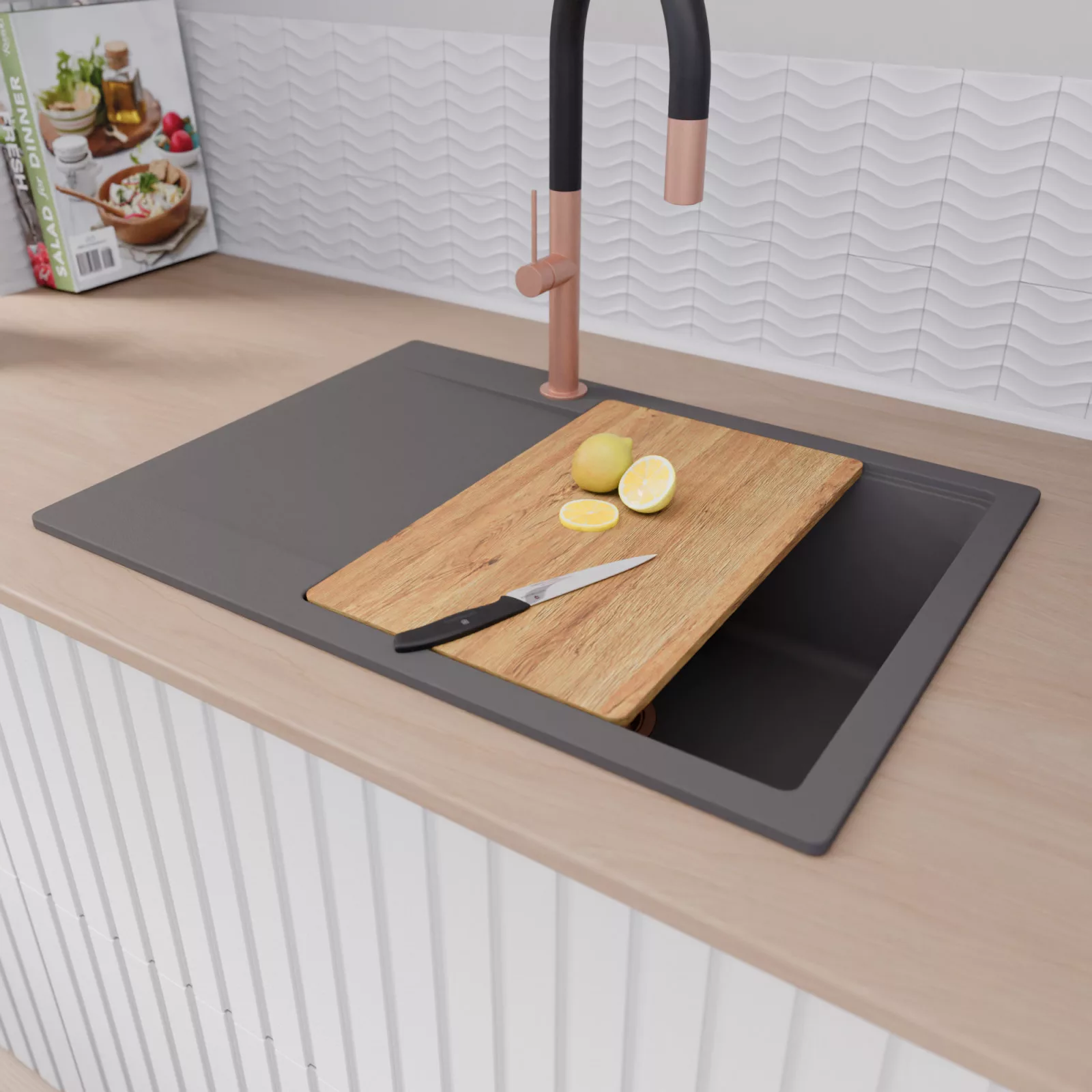 A mosogató prémium minőségű gránit kompozitból készült. Letisztult megjelenése mellett rendkívül praktikus, így bármilyen stílusú konyhába harmonikusan illeszkedik. A strapabíró gránit anyag hosszú távon is megbízható használatot garantál.