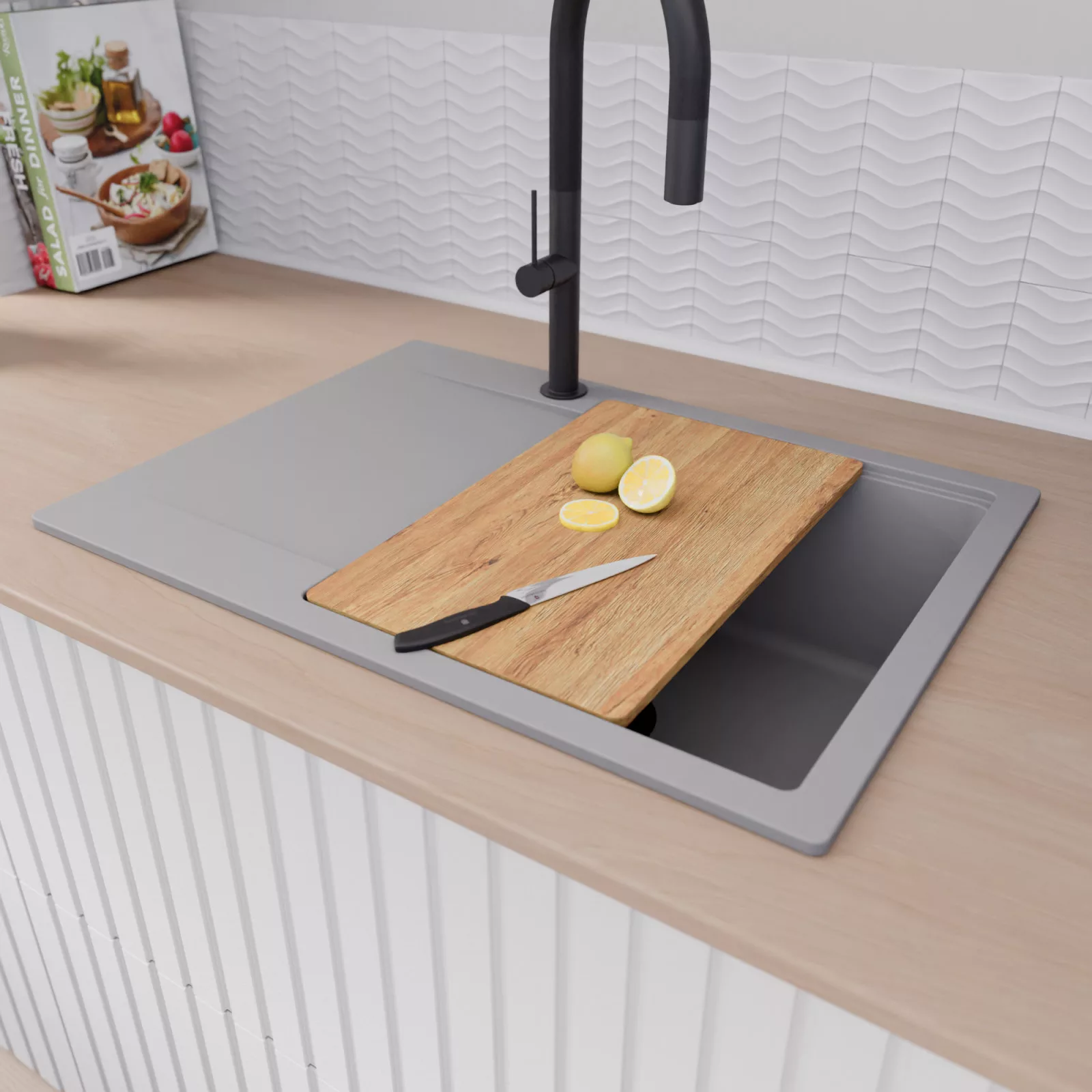 A mosogató prémium minőségű gránit kompozitból készült. Letisztult megjelenése mellett rendkívül praktikus, így bármilyen stílusú konyhába harmonikusan illeszkedik. A strapabíró gránit anyag hosszú távon is megbízható használatot garantál.