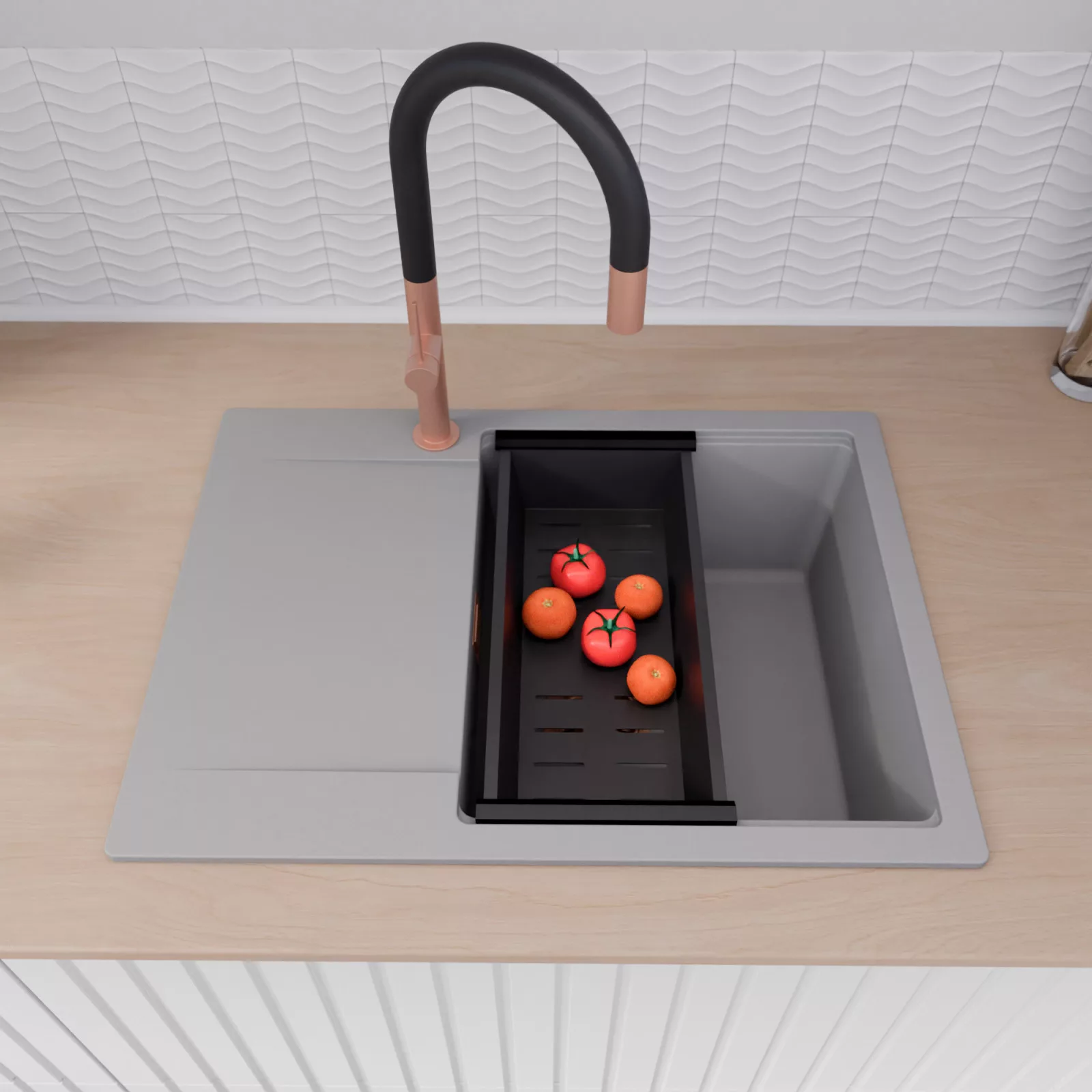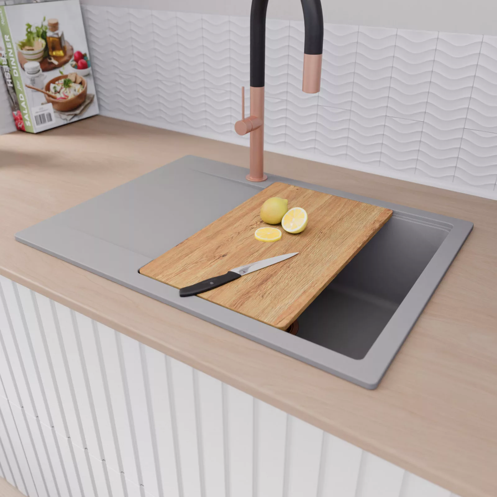 A mosogató prémium minőségű gránit kompozitból készült. Letisztult megjelenése mellett rendkívül praktikus, így bármilyen stílusú konyhába harmonikusan illeszkedik. A strapabíró gránit anyag hosszú távon is megbízható használatot garantál.