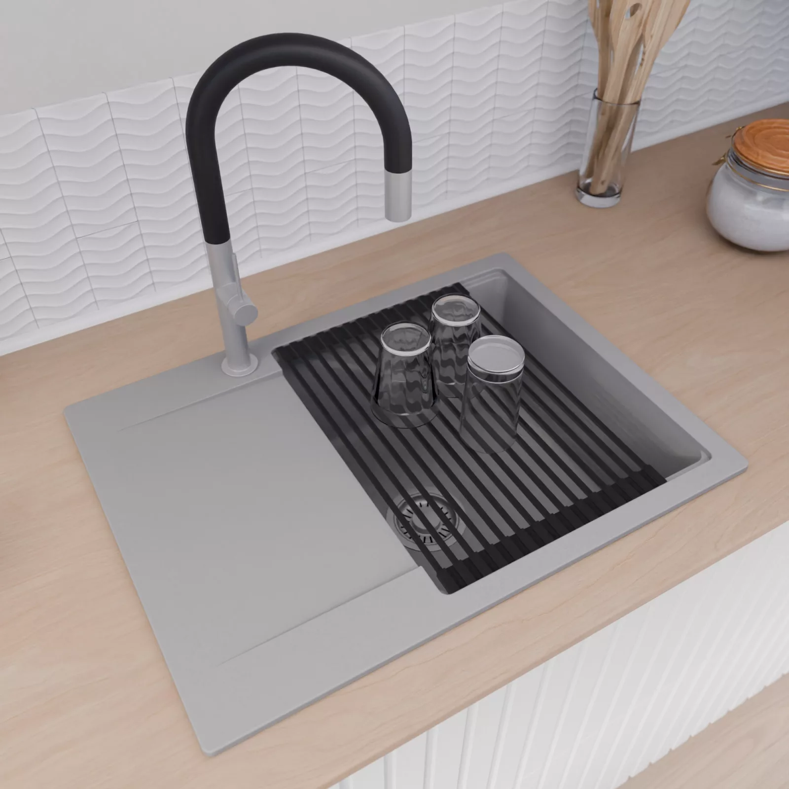 A mosogató prémium minőségű gránit kompozitból készült. Letisztult megjelenése mellett rendkívül praktikus, így bármilyen stílusú konyhába harmonikusan illeszkedik. A strapabíró gránit anyag hosszú távon is megbízható használatot garantál.