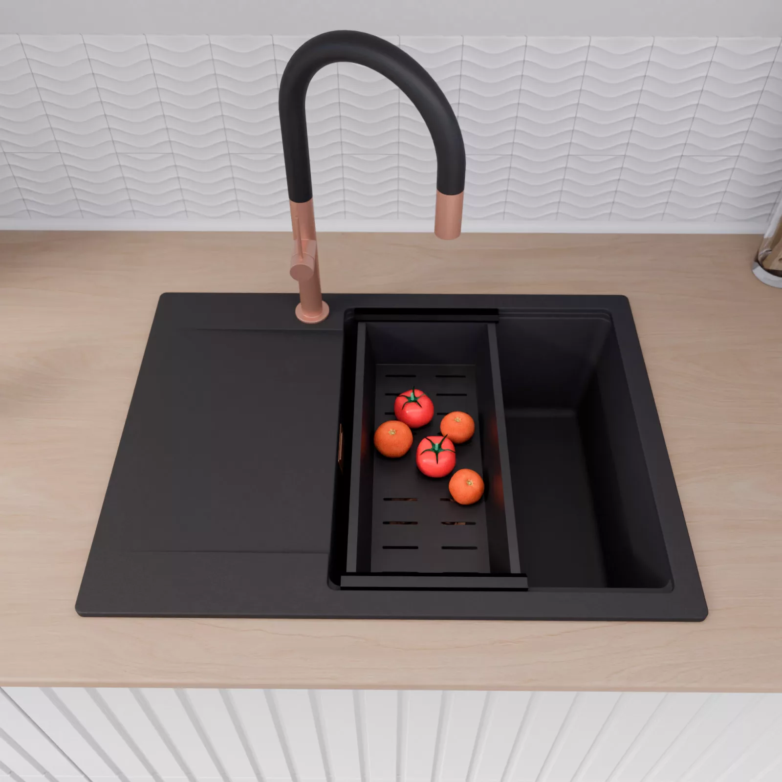 A mosogató prémium minőségű gránit kompozitból készült. Letisztult megjelenése mellett rendkívül praktikus, így bármilyen stílusú konyhába harmonikusan illeszkedik. A strapabíró gránit anyag hosszú távon is megbízható használatot garantál.
