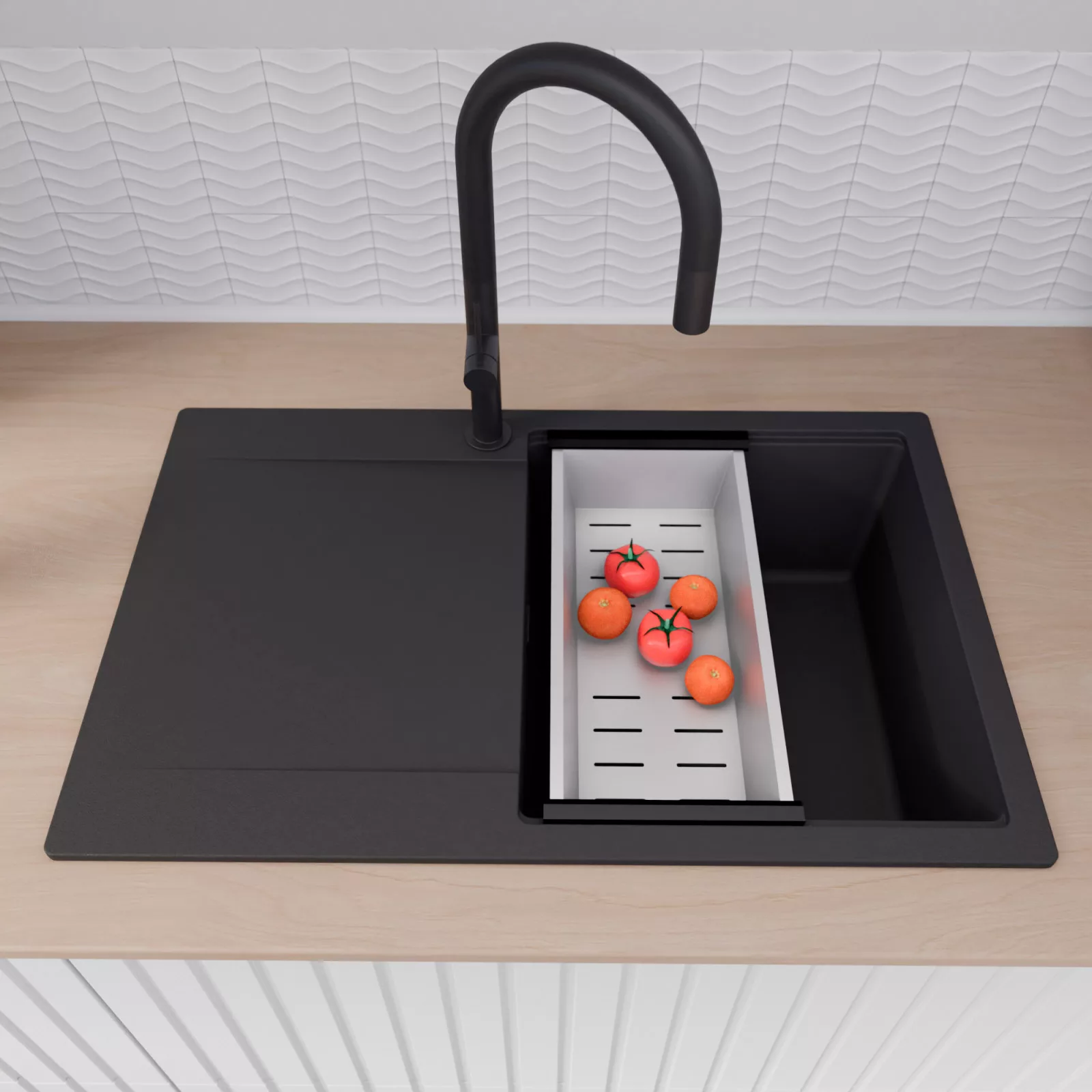 A mosogató prémium minőségű gránit kompozitból készült. Letisztult megjelenése mellett rendkívül praktikus, így bármilyen stílusú konyhába harmonikusan illeszkedik. A strapabíró gránit anyag hosszú távon is megbízható használatot garantál.