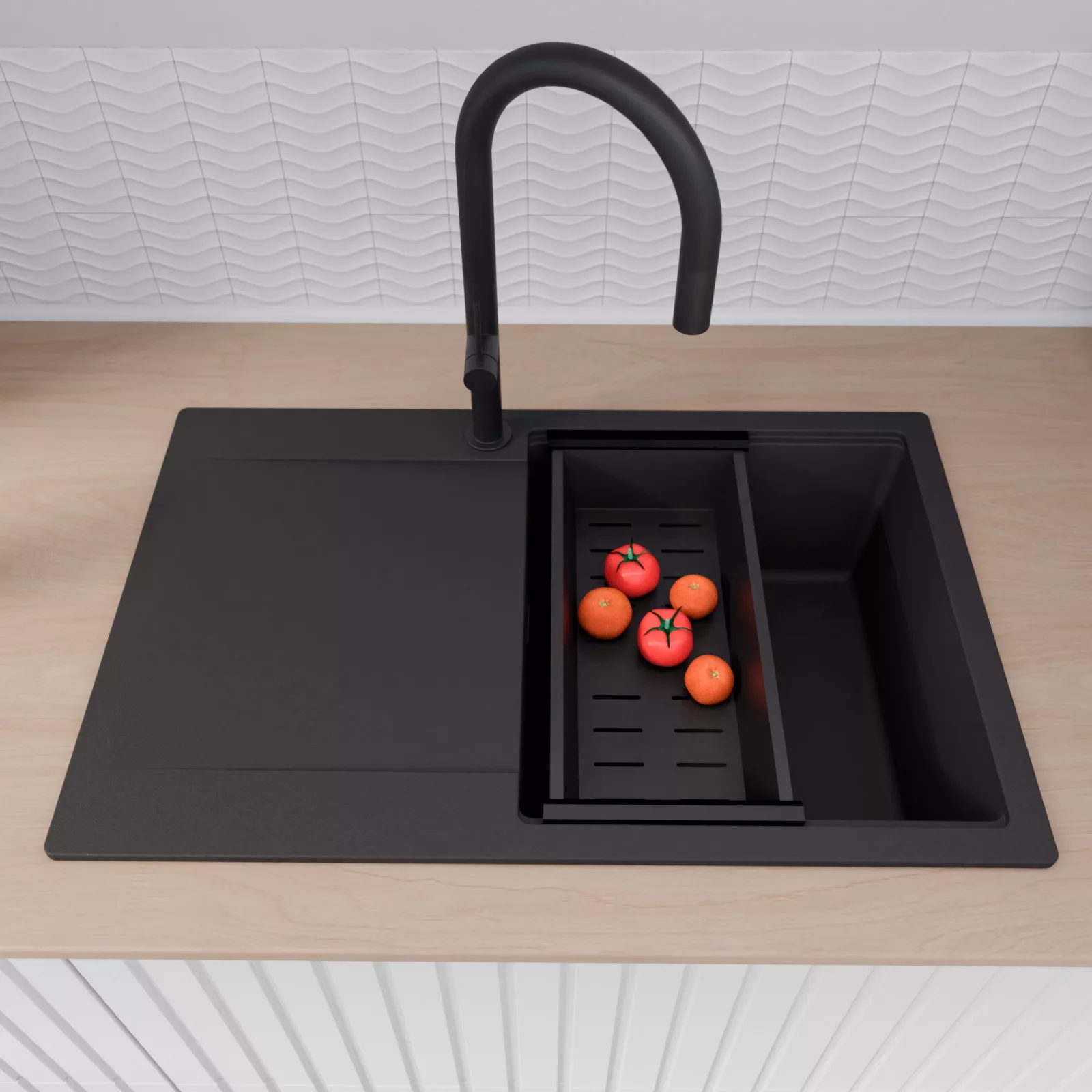 A mosogató prémium minőségű gránit kompozitból készült. Letisztult megjelenése mellett rendkívül praktikus, így bármilyen stílusú konyhába harmonikusan illeszkedik. A strapabíró gránit anyag hosszú távon is megbízható használatot garantál.