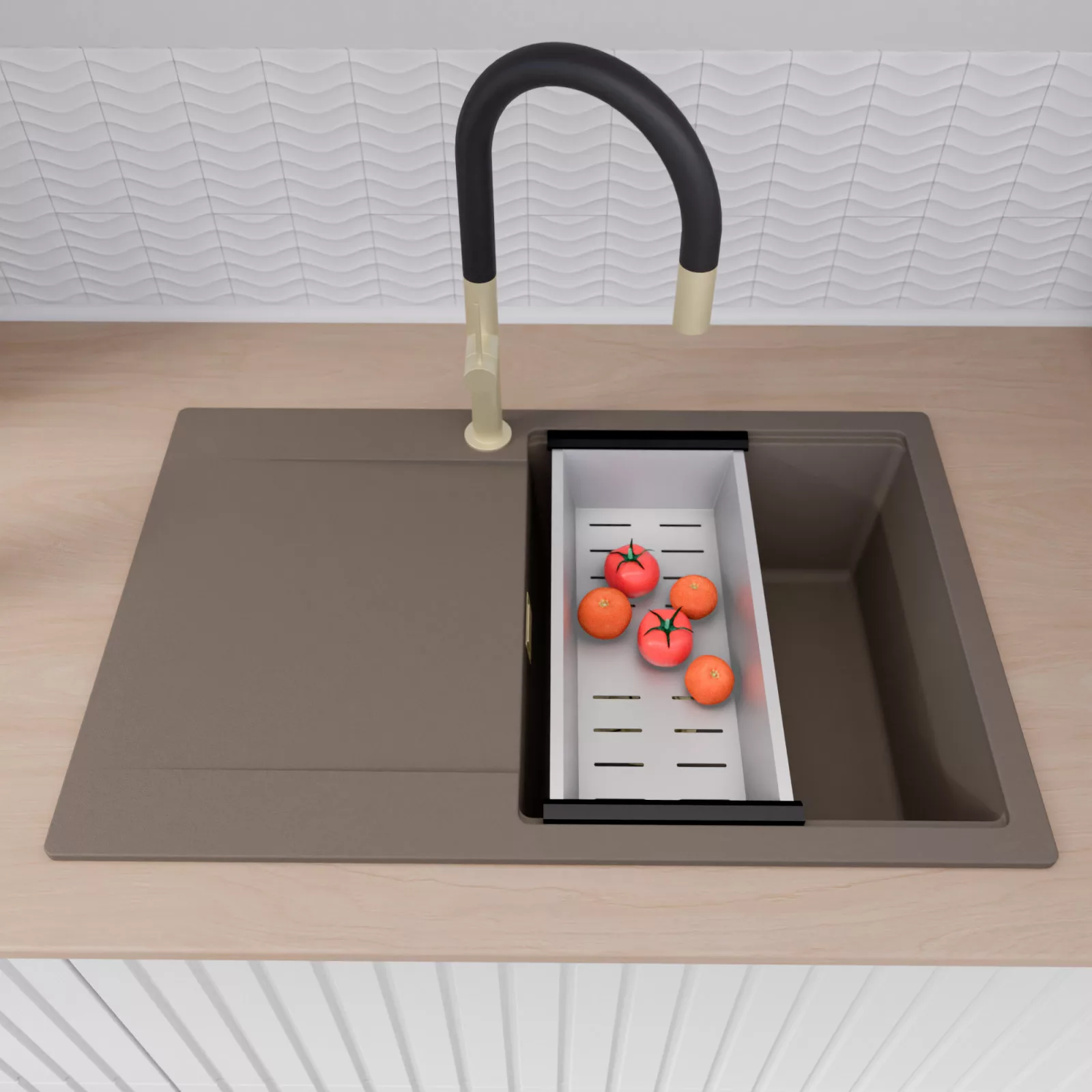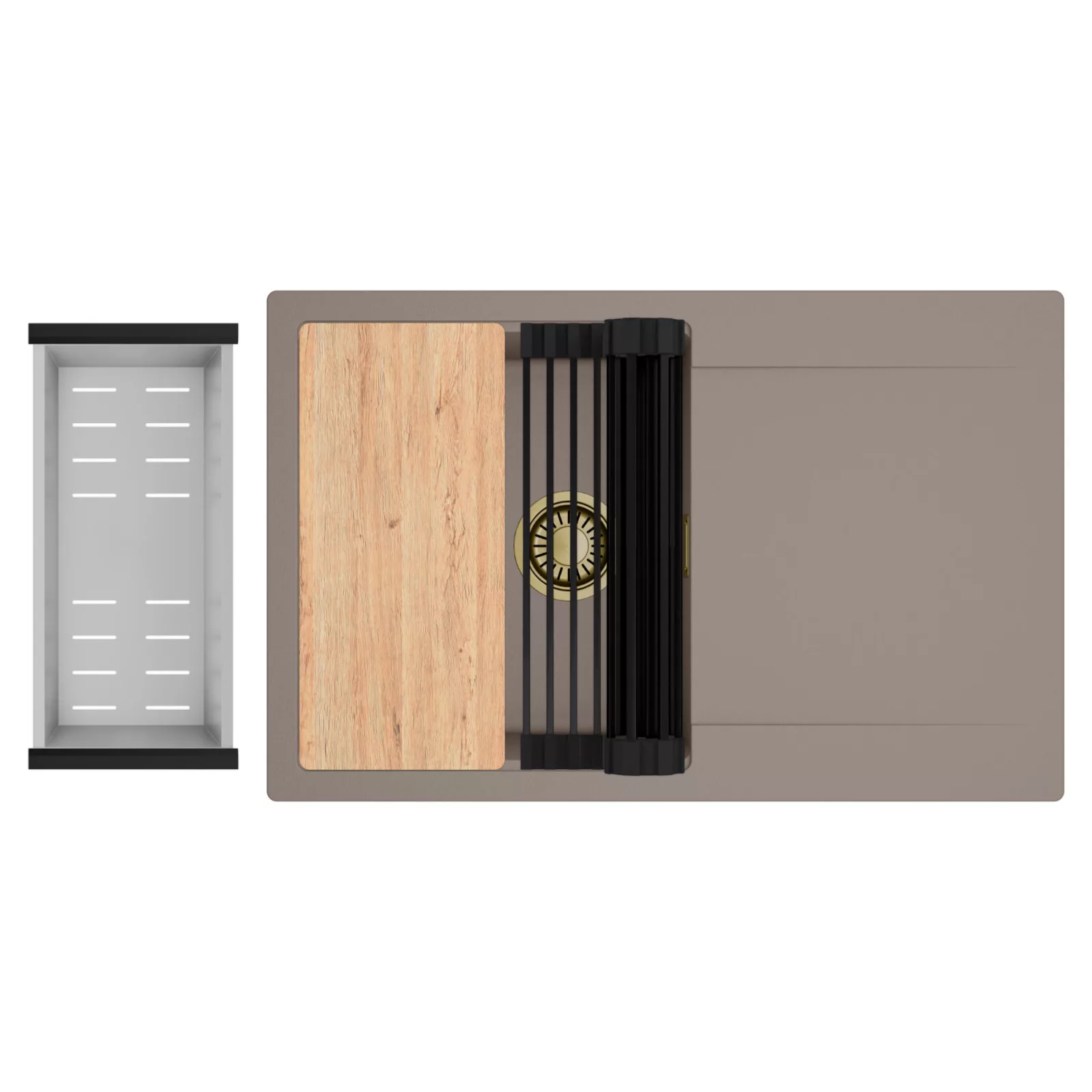 HD Onyx Tortora 78 egymedencés mosogatótálca szett, vágódeszkával, csepegtetőráccsal és kosárral, tortora
