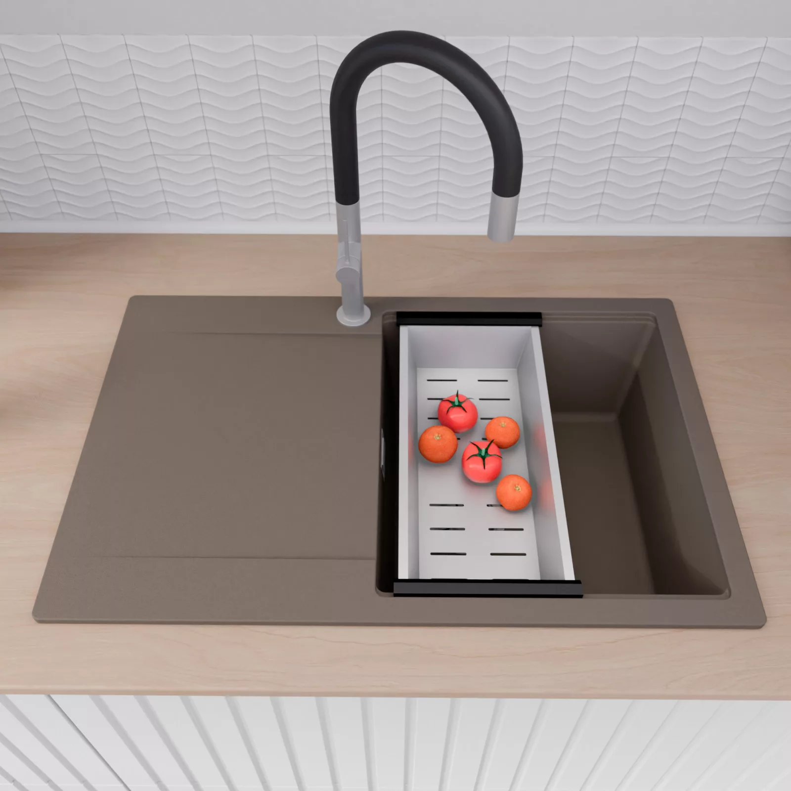 A mosogató prémium minőségű gránit kompozitból készült. Letisztult megjelenése mellett rendkívül praktikus, így bármilyen stílusú konyhába harmonikusan illeszkedik. A strapabíró gránit anyag hosszú távon is megbízható használatot garantál.