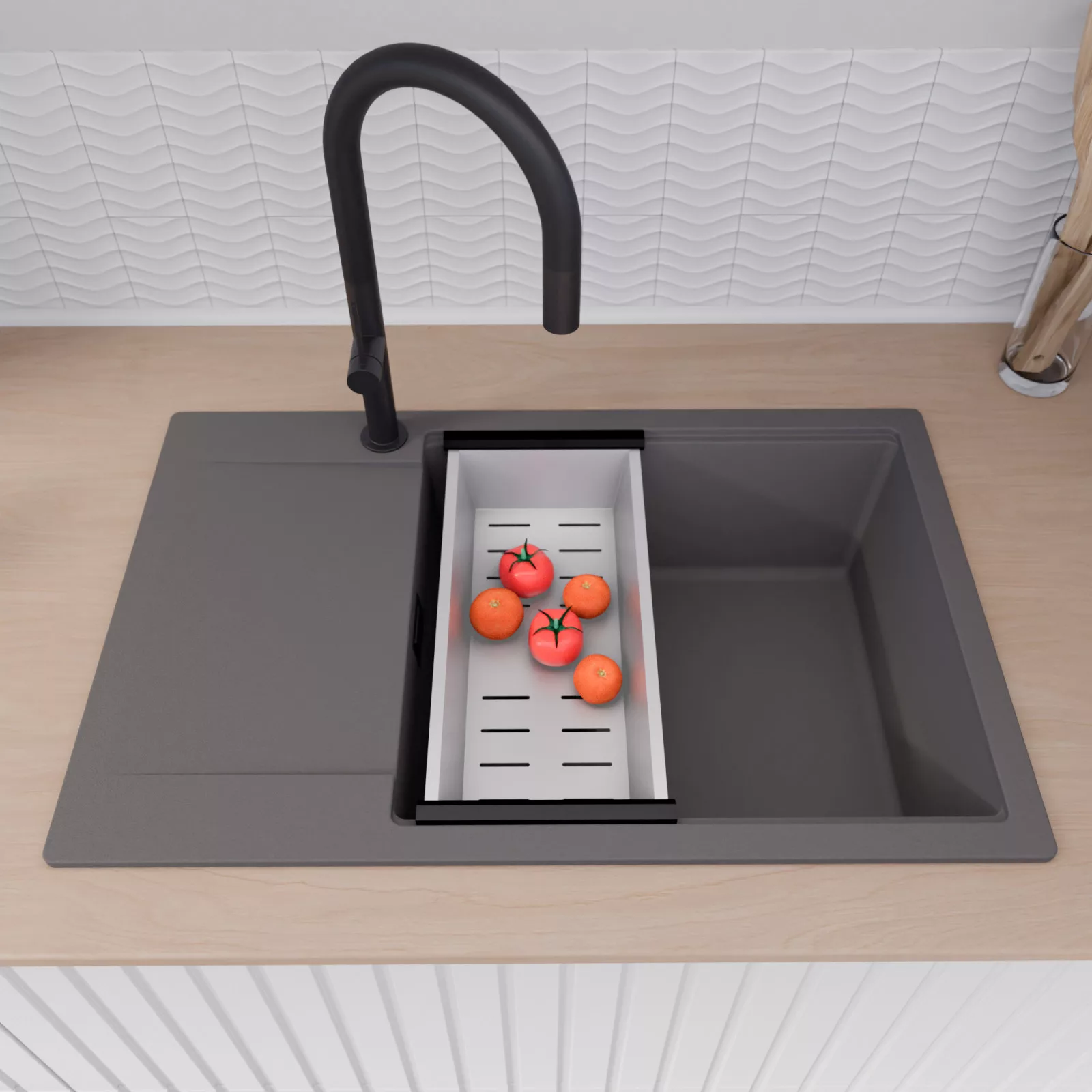 A mosogató prémium minőségű gránit kompozitból készült. Letisztult megjelenése mellett rendkívül praktikus, így bármilyen stílusú konyhába harmonikusan illeszkedik. A strapabíró gránit anyag hosszú távon is megbízható használatot garantál.