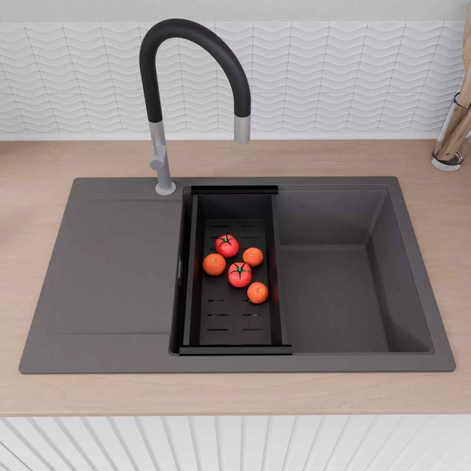 A mosogató prémium minőségű gránit kompozitból készült. Letisztult megjelenése mellett rendkívül praktikus, így bármilyen stílusú konyhába harmonikusan illeszkedik. A strapabíró gránit anyag hosszú távon is megbízható használatot garantál.