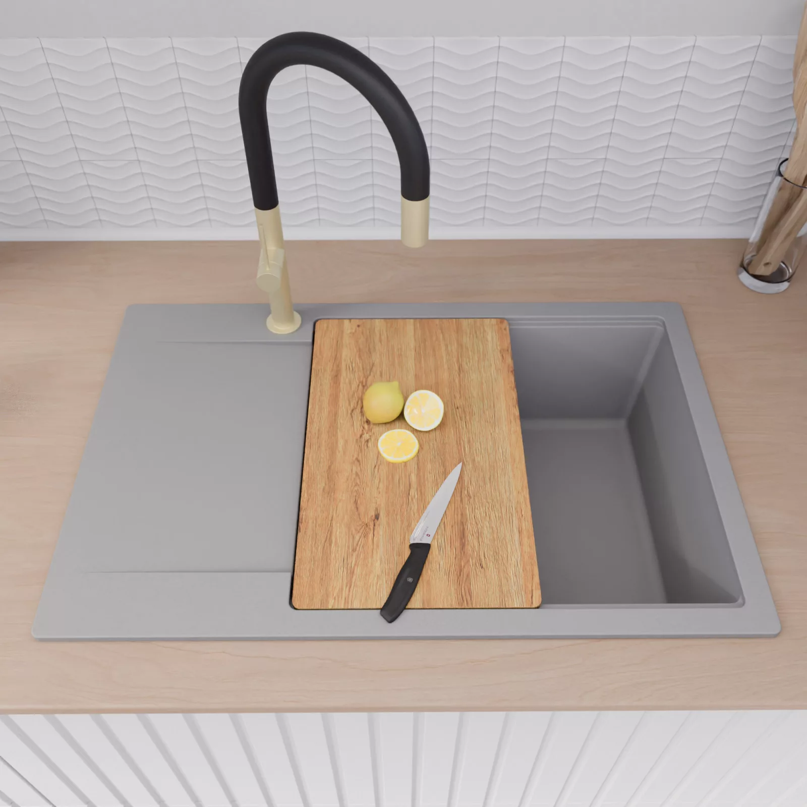 A mosogató prémium minőségű gránit kompozitból készült. Letisztult megjelenése mellett rendkívül praktikus, így bármilyen stílusú konyhába harmonikusan illeszkedik. A strapabíró gránit anyag hosszú távon is megbízható használatot garantál.