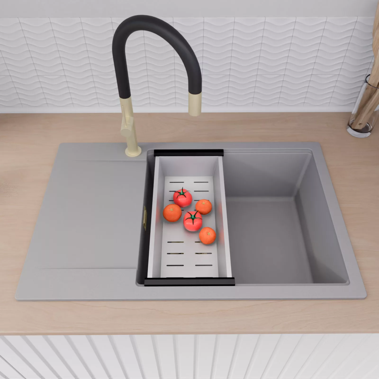 A mosogató prémium minőségű gránit kompozitból készült. Letisztult megjelenése mellett rendkívül praktikus, így bármilyen stílusú konyhába harmonikusan illeszkedik. A strapabíró gránit anyag hosszú távon is megbízható használatot garantál.