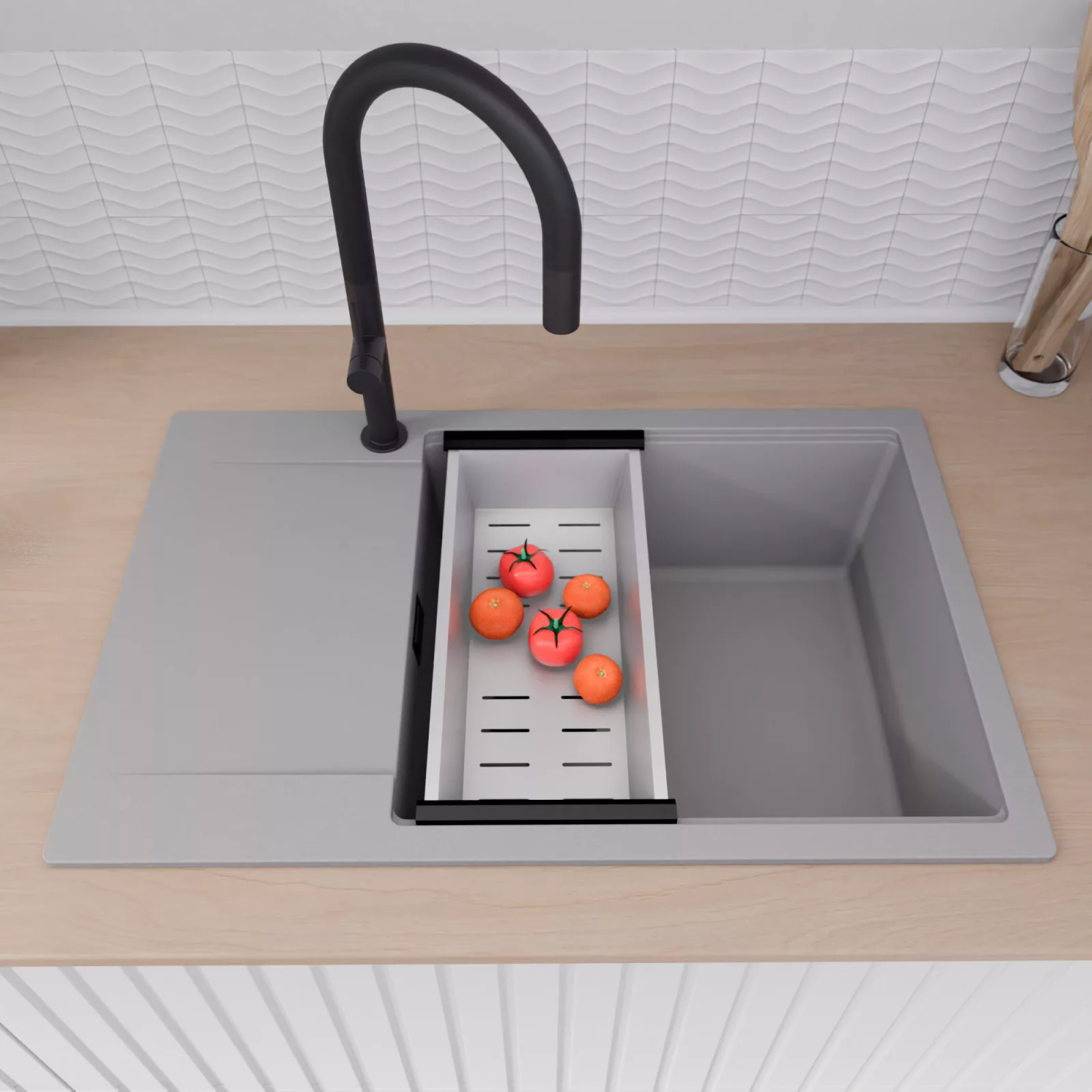 A mosogató prémium minőségű gránit kompozitból készült. Letisztult megjelenése mellett rendkívül praktikus, így bármilyen stílusú konyhába harmonikusan illeszkedik. A strapabíró gránit anyag hosszú távon is megbízható használatot garantál.