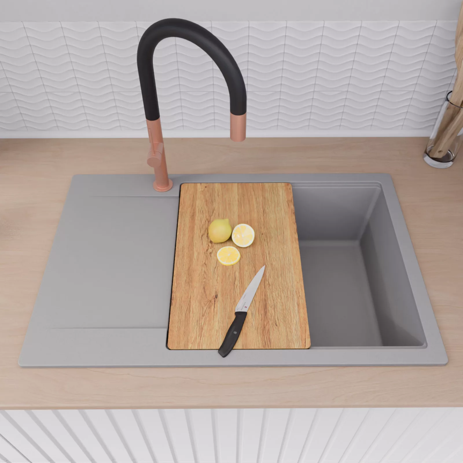 A mosogató prémium minőségű gránit kompozitból készült. Letisztult megjelenése mellett rendkívül praktikus, így bármilyen stílusú konyhába harmonikusan illeszkedik. A strapabíró gránit anyag hosszú távon is megbízható használatot garantál.