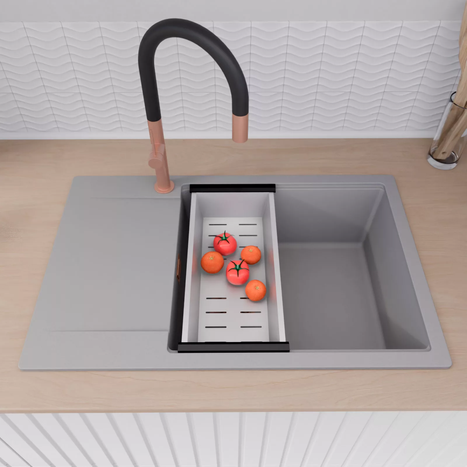 A mosogató prémium minőségű gránit kompozitból készült. Letisztult megjelenése mellett rendkívül praktikus, így bármilyen stílusú konyhába harmonikusan illeszkedik. A strapabíró gránit anyag hosszú távon is megbízható használatot garantál.