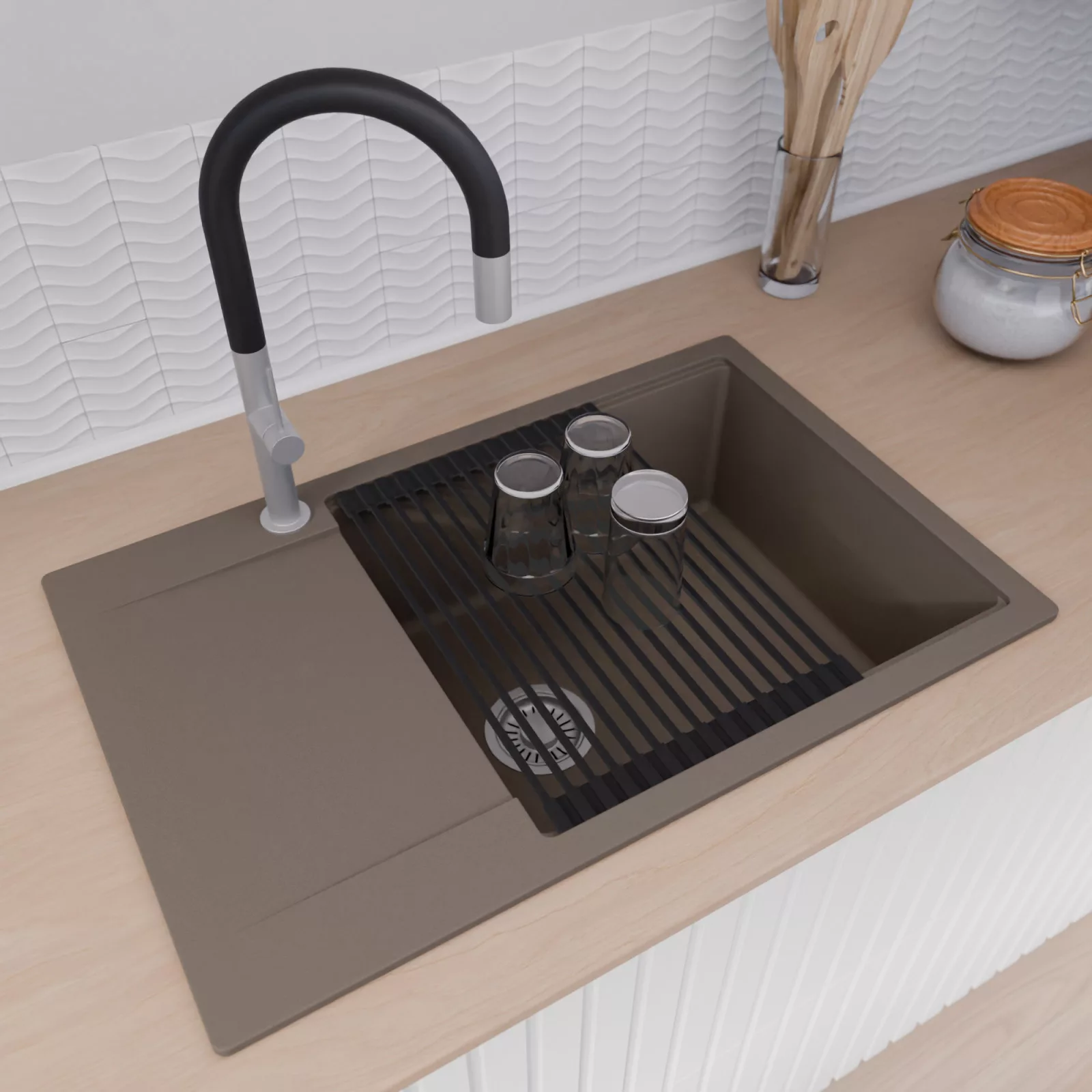 A mosogató prémium minőségű gránit kompozitból készült. Letisztult megjelenése mellett rendkívül praktikus, így bármilyen stílusú konyhába harmonikusan illeszkedik. A strapabíró gránit anyag hosszú távon is megbízható használatot garantál.