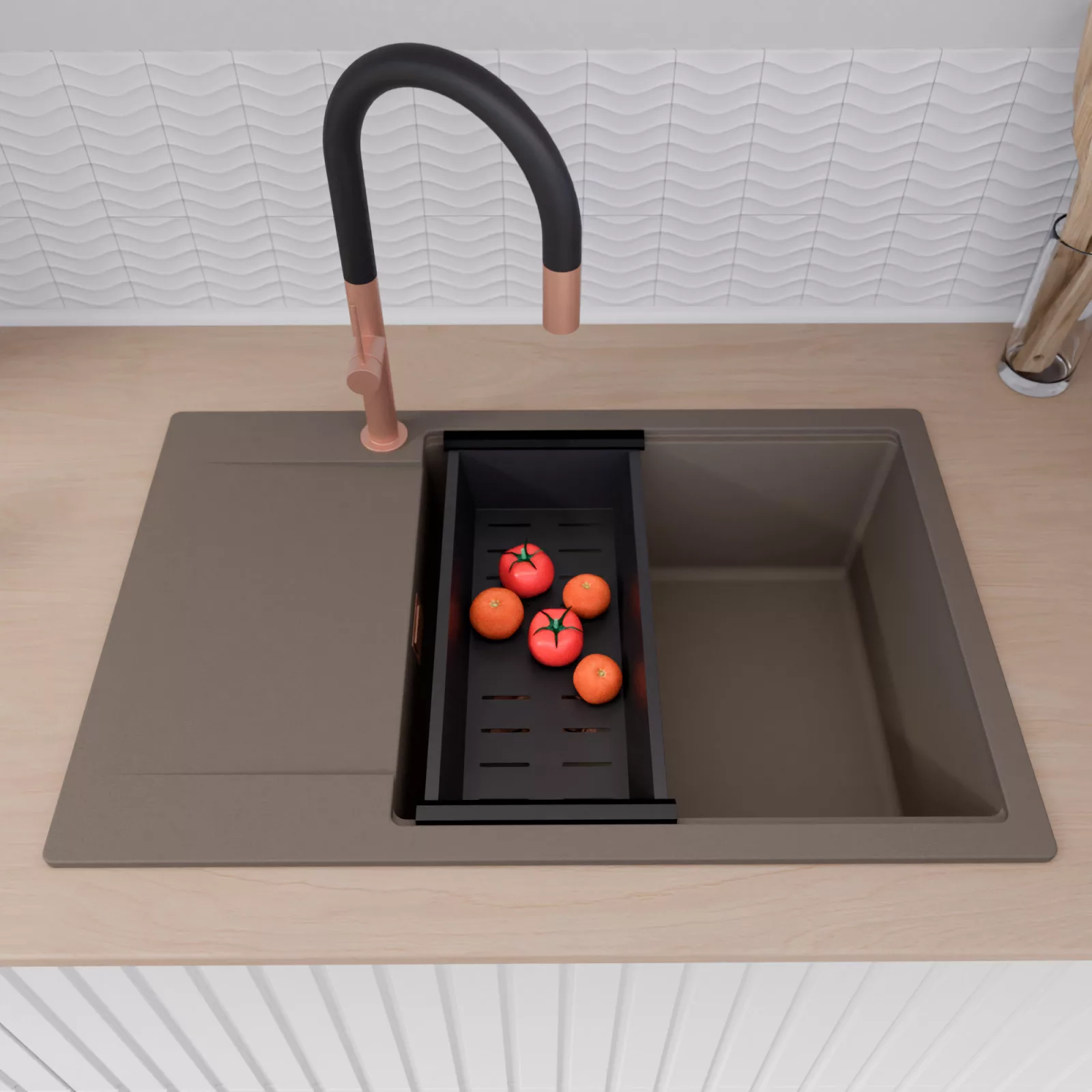 HD Onyx Tortora 78-XL egymedencés mosogatótálca szett, vágódeszkával, csepegtetőráccsal és kosárral, tortora