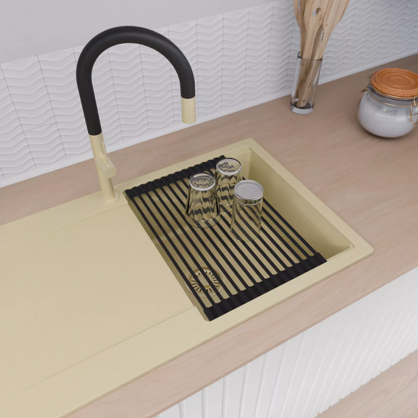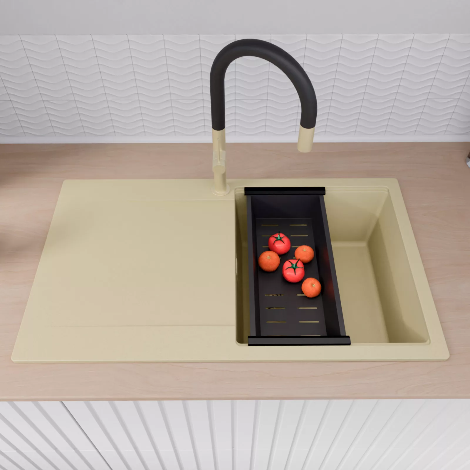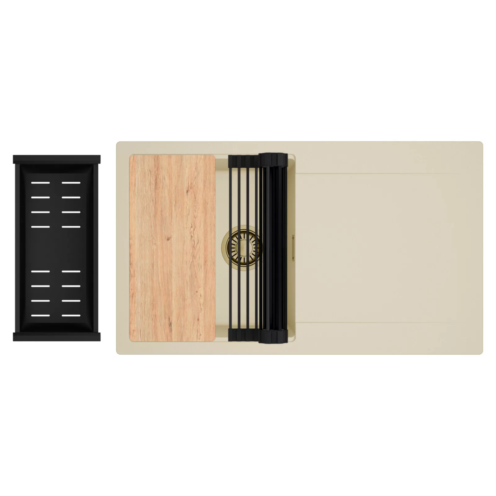 HD Onyx Beige 86 egymedencés mosogatótálca szett, vágódeszkával, csepegtetőráccsal és kosárral, soft bézs
