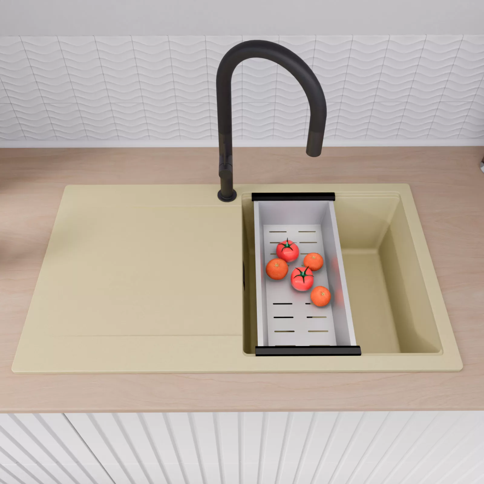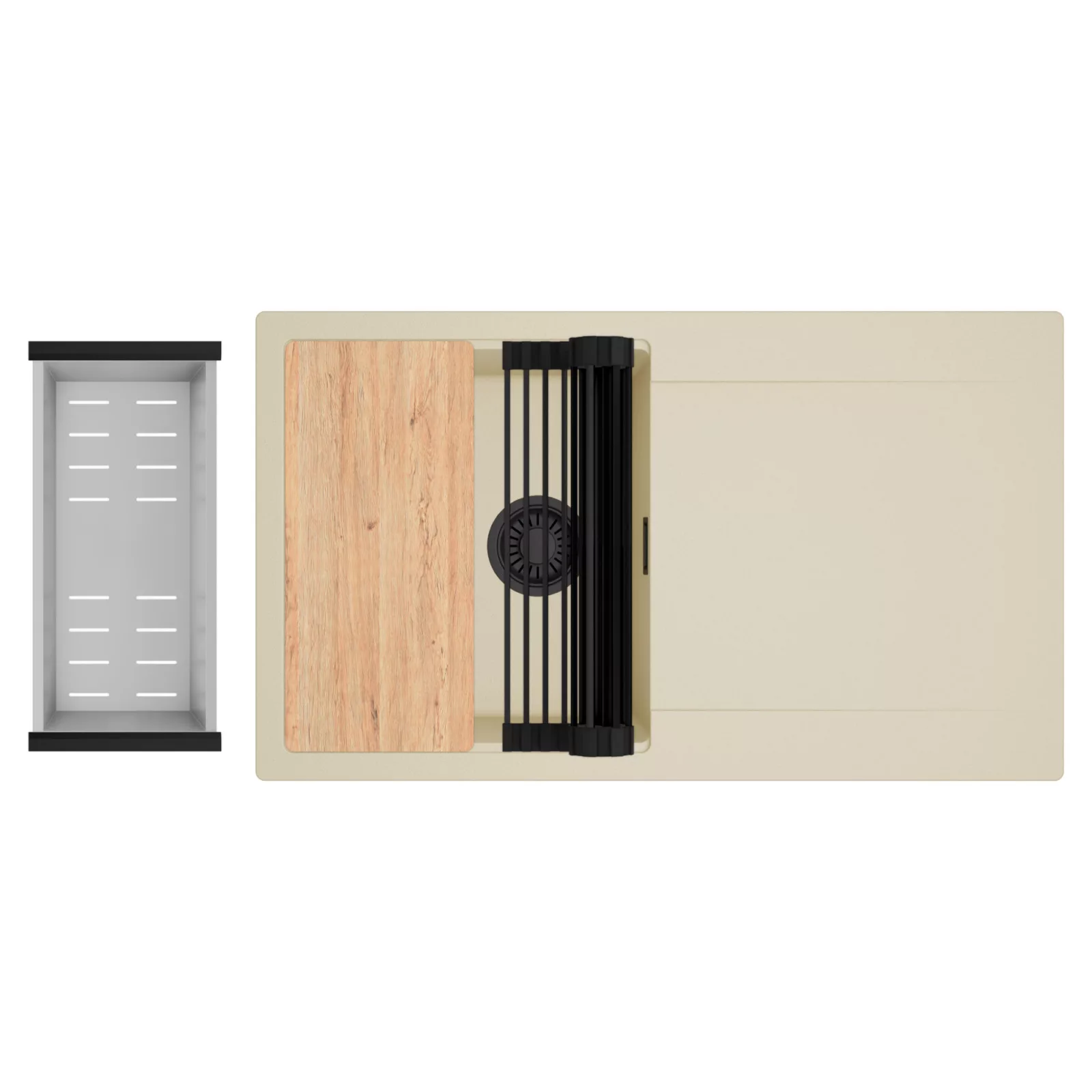 HD Onyx Beige 86 egymedencés mosogatótálca szett, vágódeszkával, csepegtetőráccsal és kosárral, soft bézs