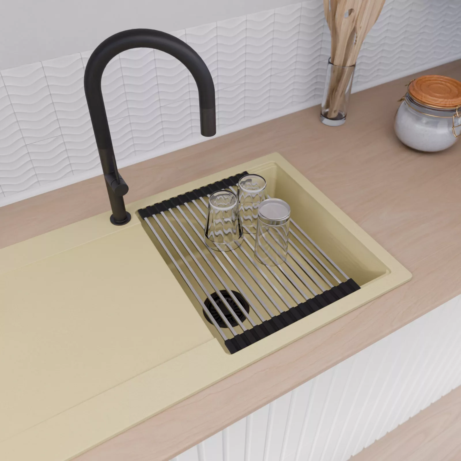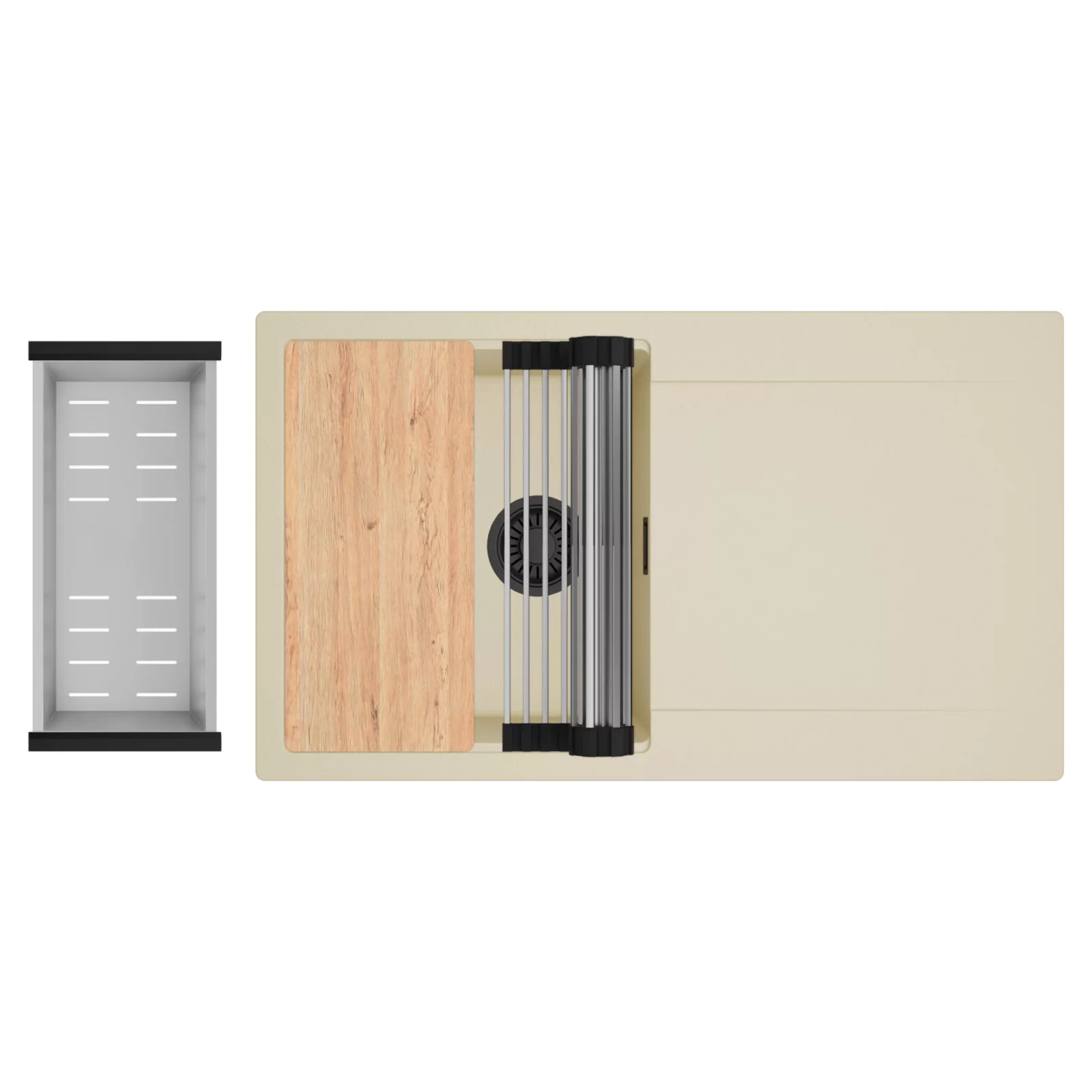 HD Onyx Beige 86 egymedencés mosogatótálca szett, vágódeszkával, csepegtetőráccsal és kosárral, soft bézs