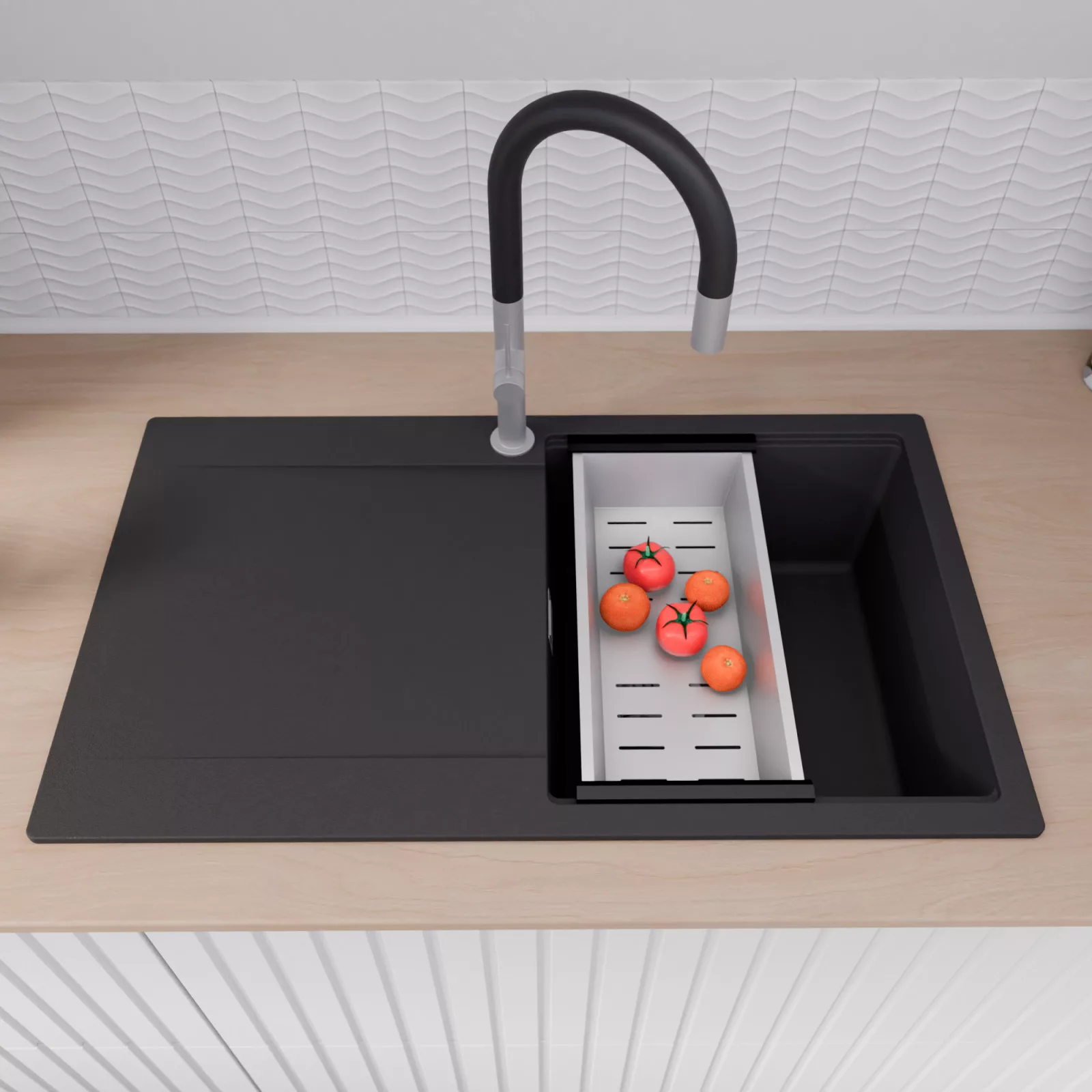 A mosogató prémium minőségű gránit kompozitból készült. Letisztult megjelenése mellett rendkívül praktikus, így bármilyen stílusú konyhába harmonikusan illeszkedik. A strapabíró gránit anyag hosszú távon is megbízható használatot garantál.