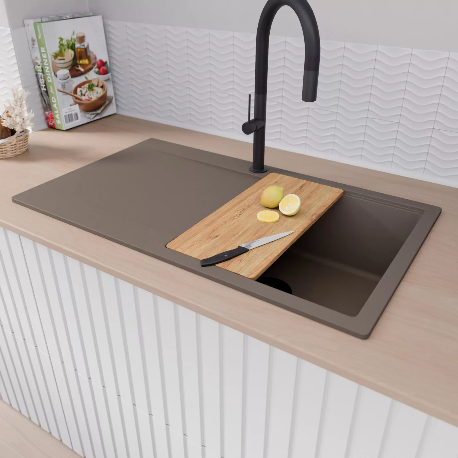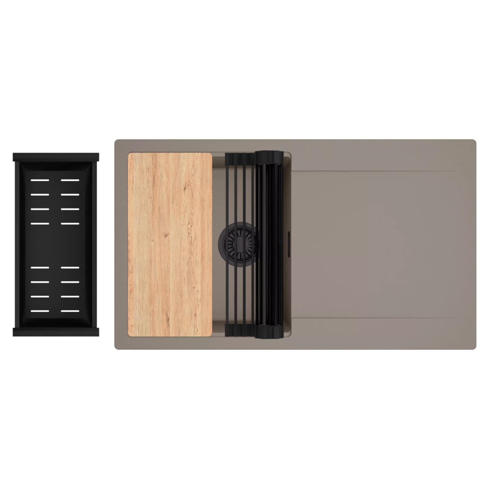 HD Onyx Tortora 86 egymedencés mosogatótálca szett, vágódeszkával, csepegtetőráccsal és kosárral, tortora