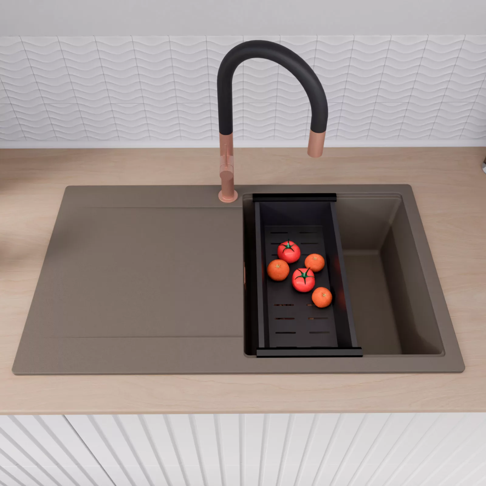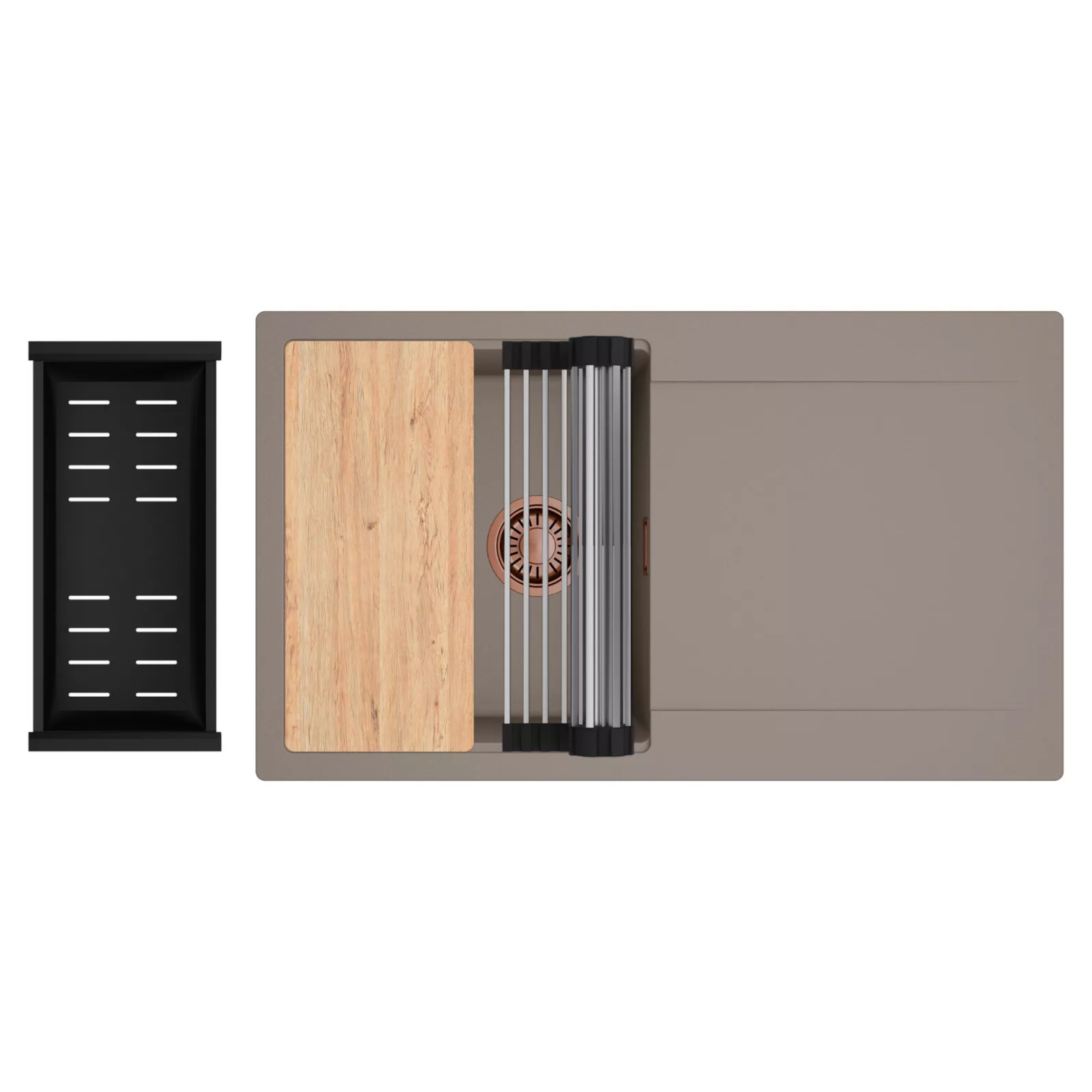 HD Onyx Tortora 86 egymedencés mosogatótálca szett, vágódeszkával, csepegtetőráccsal és kosárral, tortora
