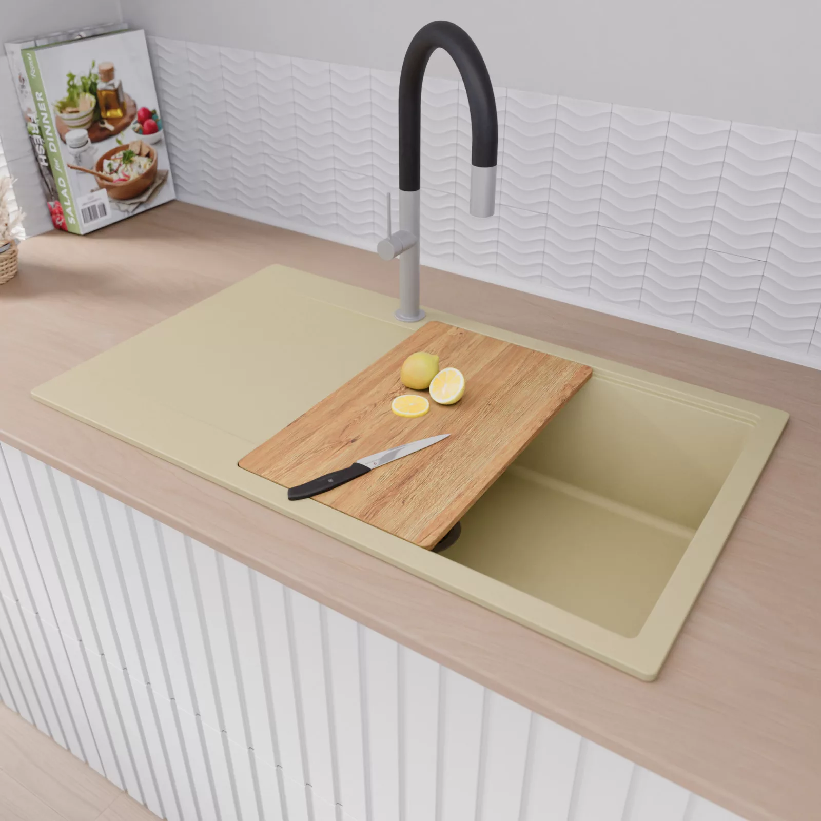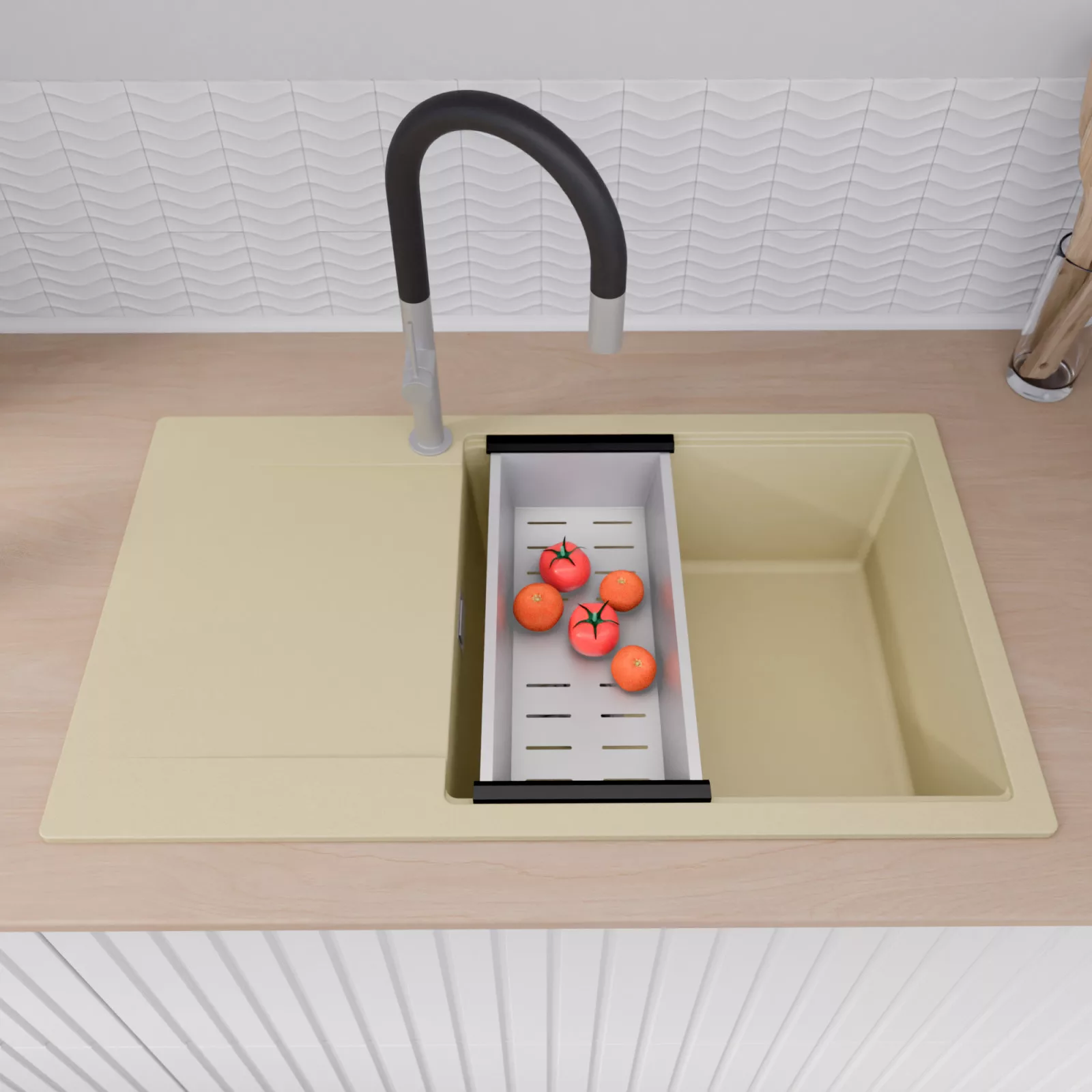 HD Onyx Beige 86-XL egymedencés mosogatótálca szett, vágódeszkával, csepegtetőráccsal és kosárral, soft bézs