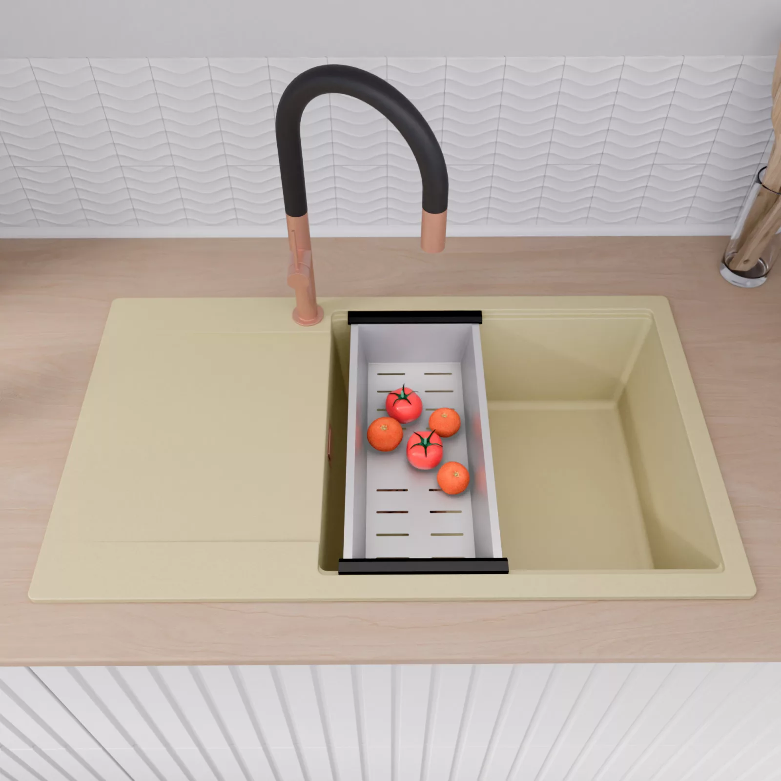 Mosogatónk magas természetes kőőrlemény-tartalmú gránit kompozitból készül, amely rendkívüli stabilitást és tartósságot biztosít. Az anyag ellenáll a magas hőmérsékletnek, a hirtelen hőingadozásoknak, valamint az ütéseknek és karcolásoknak is. Sima, zárt felülete könnyen tisztán tartható, ellenáll a foltosodásnak és az elszíneződéseknek, így hosszú éveken át megőrzi esztétikus megjelenését. Meggyőződésünk, hogy ezzel a gránit mosogatóval a mindennapi konyhai teendők kényelmesebbé és élvezetesebbé válnak.