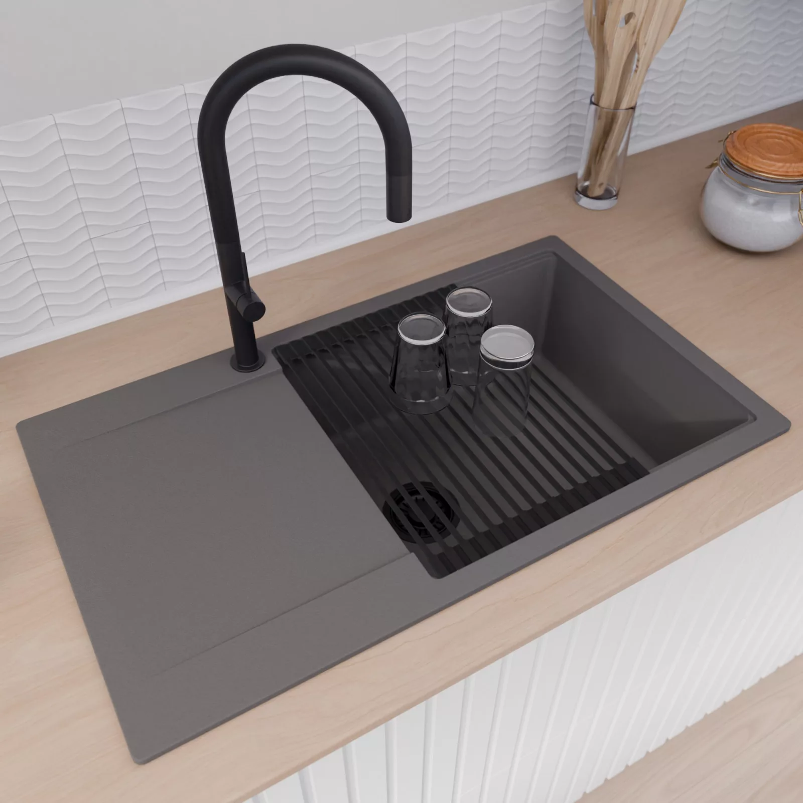 A mosogató prémium minőségű gránit kompozitból készült. Letisztult megjelenése mellett rendkívül praktikus, így bármilyen stílusú konyhába harmonikusan illeszkedik. A strapabíró gránit anyag hosszú távon is megbízható használatot garantál.