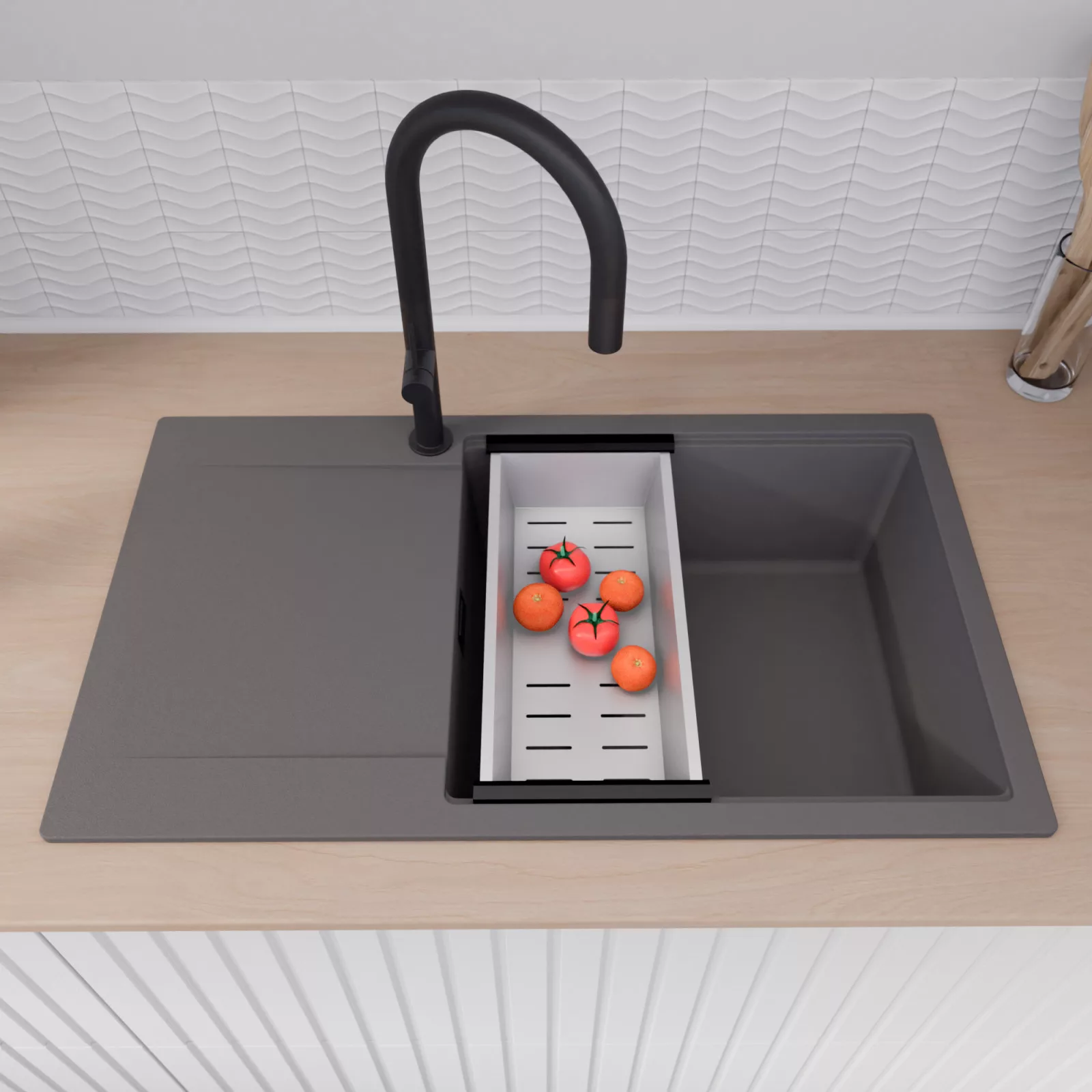 A mosogató prémium minőségű gránit kompozitból készült. Letisztult megjelenése mellett rendkívül praktikus, így bármilyen stílusú konyhába harmonikusan illeszkedik. A strapabíró gránit anyag hosszú távon is megbízható használatot garantál.