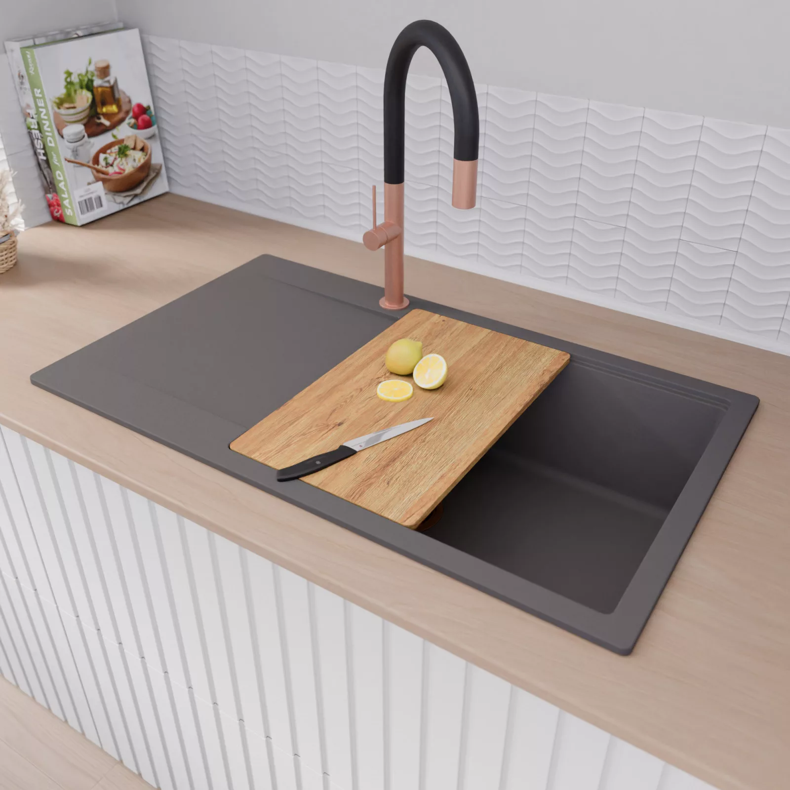 A mosogató prémium minőségű gránit kompozitból készült. Letisztult megjelenése mellett rendkívül praktikus, így bármilyen stílusú konyhába harmonikusan illeszkedik. A strapabíró gránit anyag hosszú távon is megbízható használatot garantál.