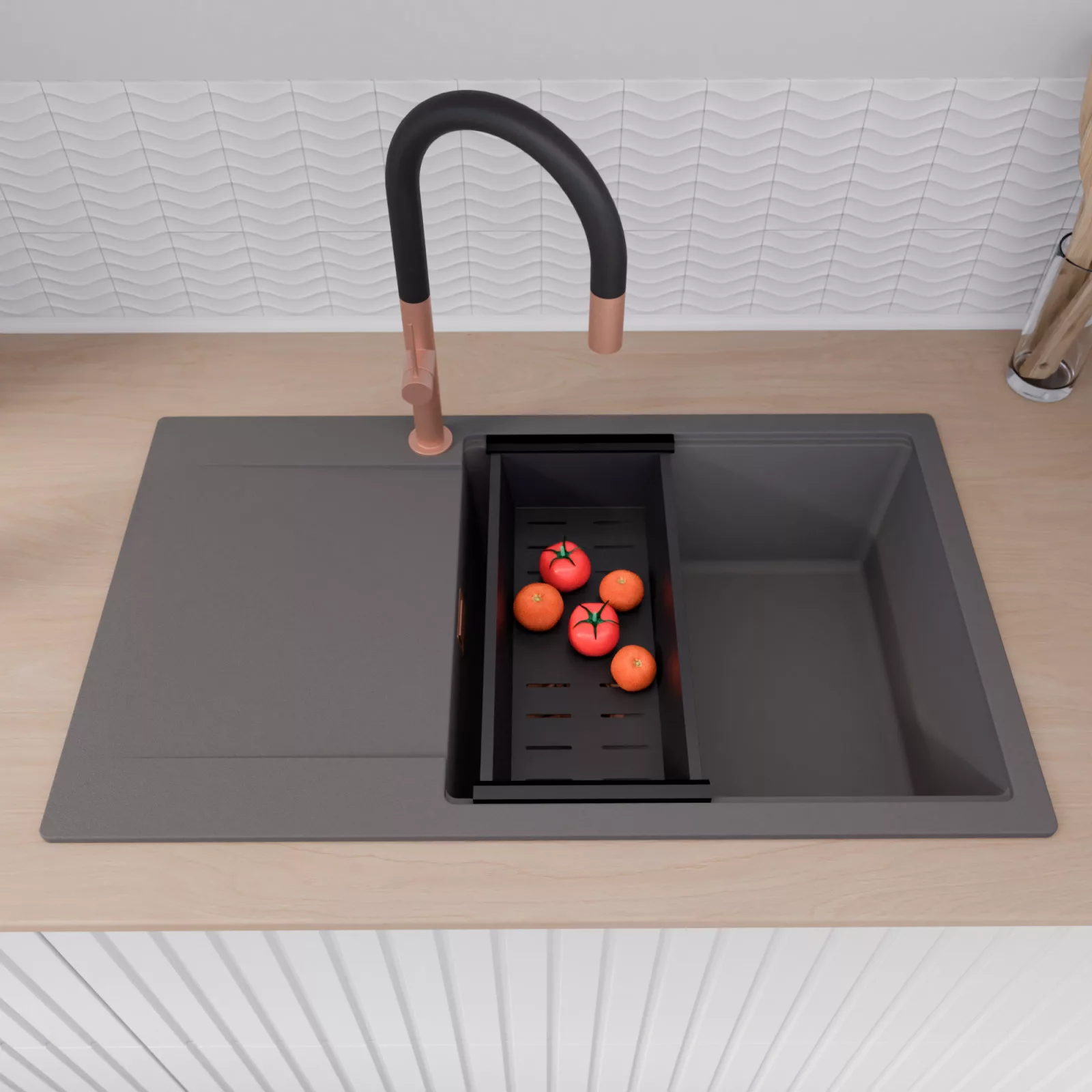A mosogató prémium minőségű gránit kompozitból készült. Letisztult megjelenése mellett rendkívül praktikus, így bármilyen stílusú konyhába harmonikusan illeszkedik. A strapabíró gránit anyag hosszú távon is megbízható használatot garantál.
