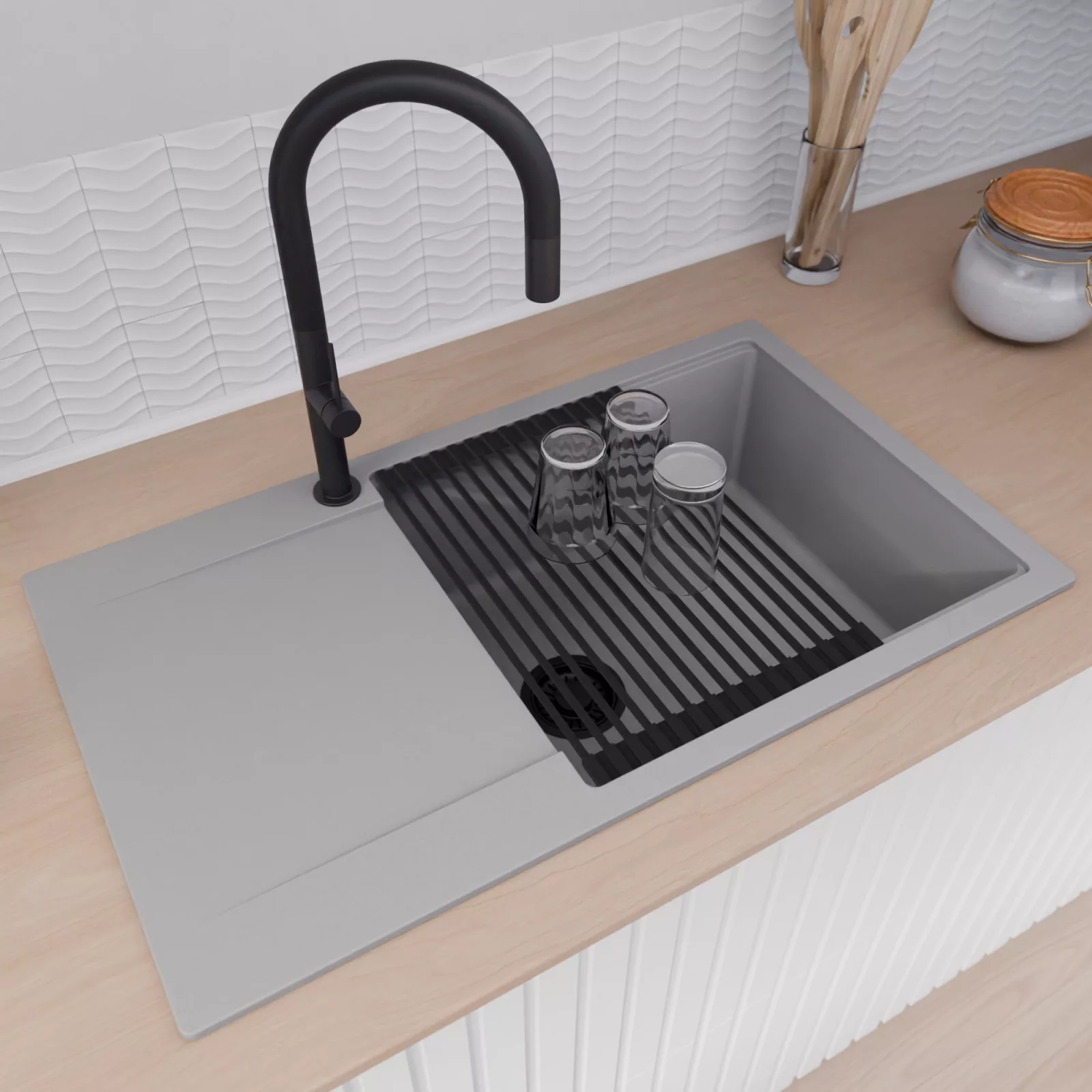 A mosogató prémium minőségű gránit kompozitból készült. Letisztult megjelenése mellett rendkívül praktikus, így bármilyen stílusú konyhába harmonikusan illeszkedik. A strapabíró gránit anyag hosszú távon is megbízható használatot garantál.