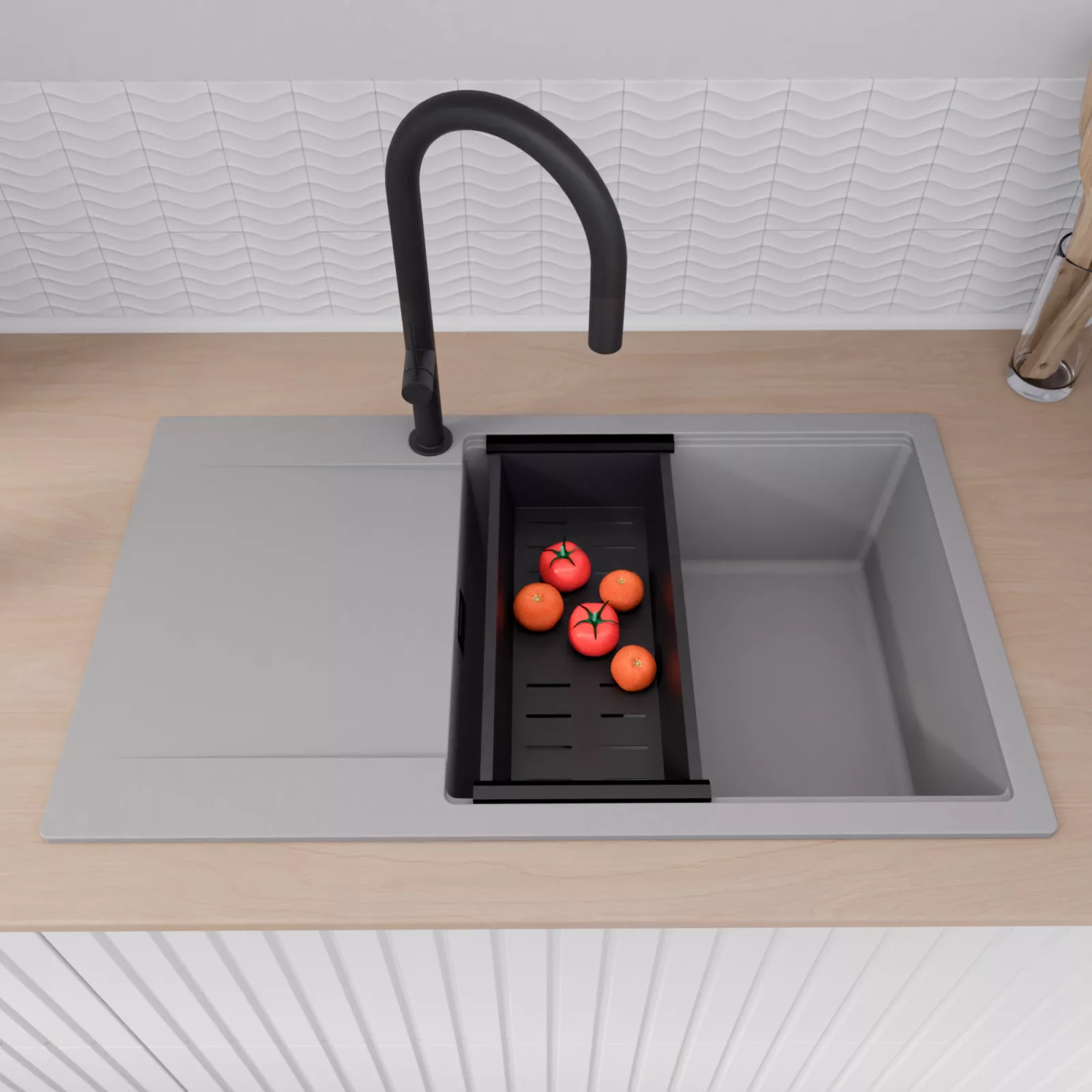A mosogató prémium minőségű gránit kompozitból készült. Letisztult megjelenése mellett rendkívül praktikus, így bármilyen stílusú konyhába harmonikusan illeszkedik. A strapabíró gránit anyag hosszú távon is megbízható használatot garantál.