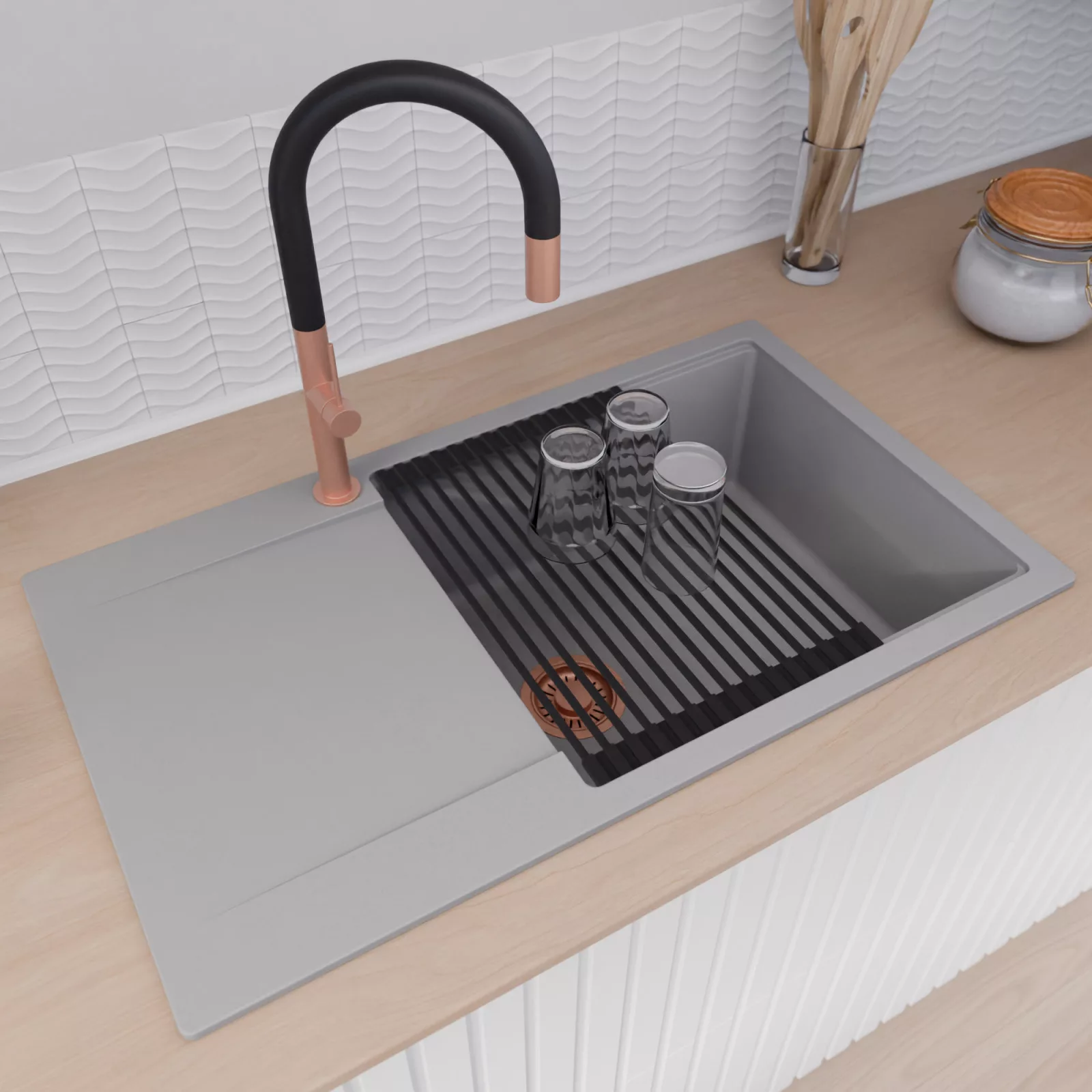 A mosogató prémium minőségű gránit kompozitból készült. Letisztult megjelenése mellett rendkívül praktikus, így bármilyen stílusú konyhába harmonikusan illeszkedik. A strapabíró gránit anyag hosszú távon is megbízható használatot garantál.