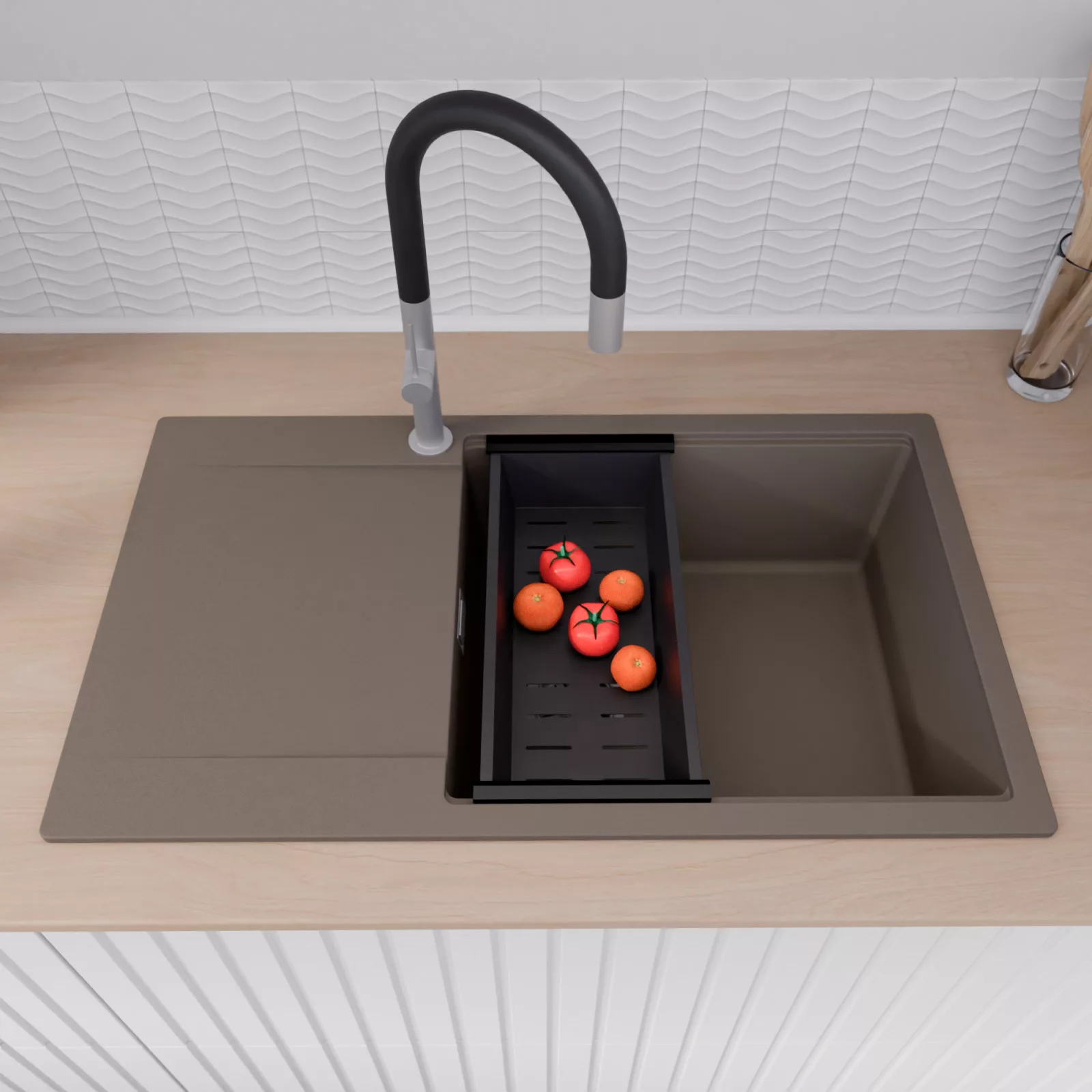 HD Onyx Tortora 86-XL egymedencés mosogatótálca szett, vágódeszkával, csepegtetőráccsal és kosárral, tortora