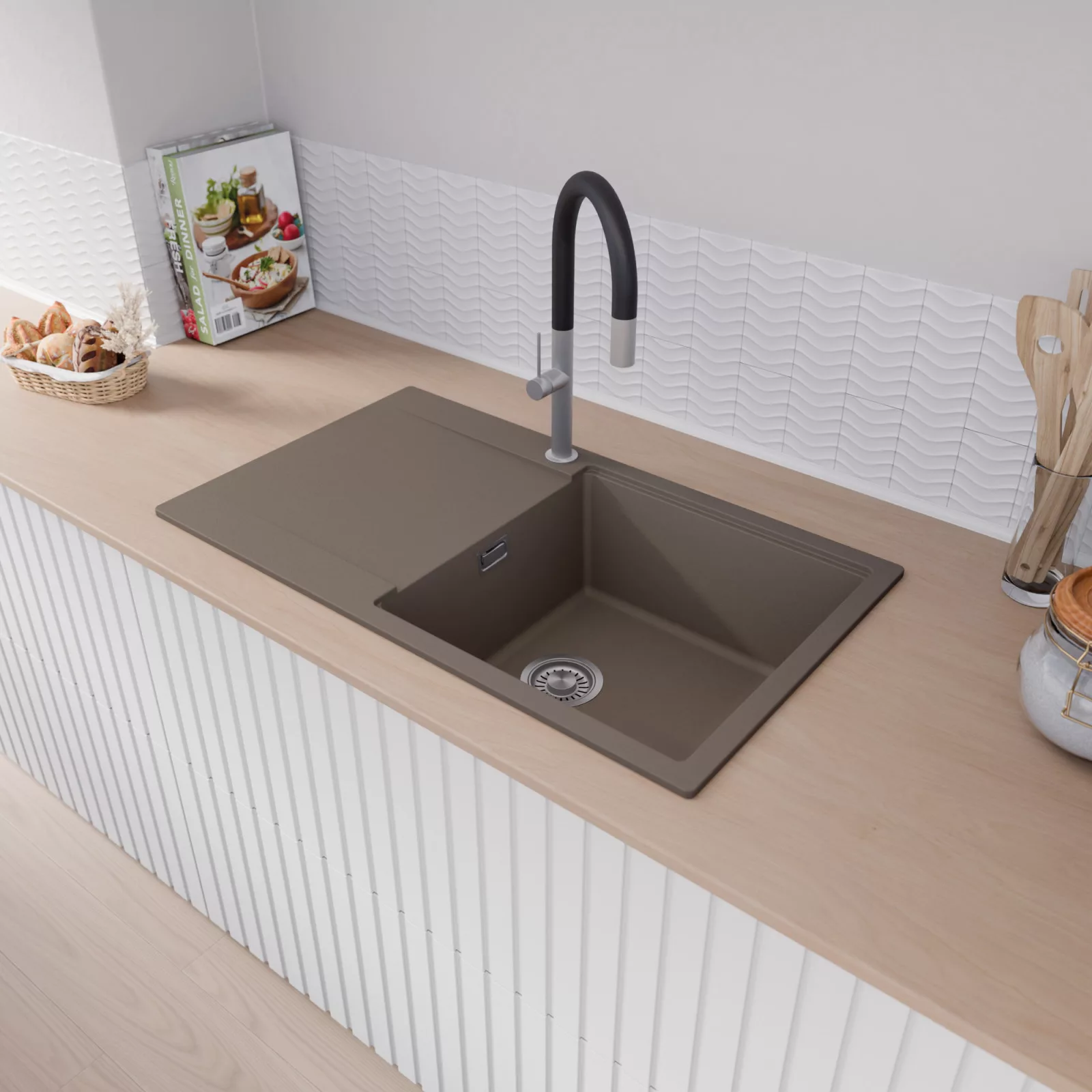 A mosogató prémium minőségű gránit kompozitból készült. Letisztult megjelenése mellett rendkívül praktikus, így bármilyen stílusú konyhába harmonikusan illeszkedik. A strapabíró gránit anyag hosszú távon is megbízható használatot garantál.