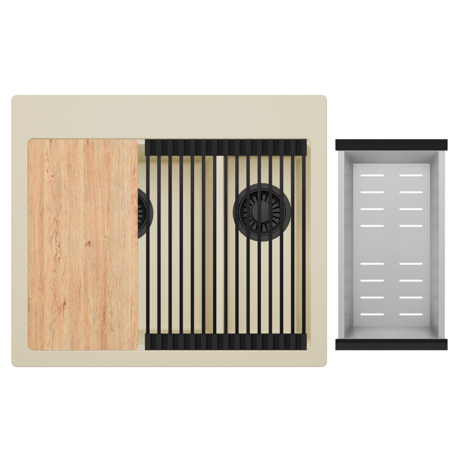 HD Aspen Beige 58 Kétmedencés mosogatótálca szett, vágódeszkával, csepegtetőráccsal és kosárral, soft bézs