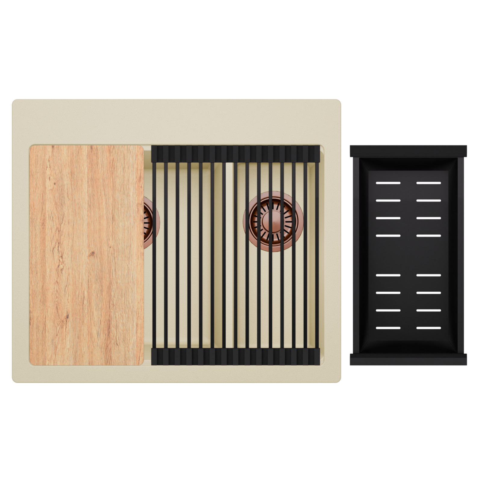 HD Aspen Beige 58 Kétmedencés mosogatótálca szett, vágódeszkával, csepegtetőráccsal és kosárral, soft bézs