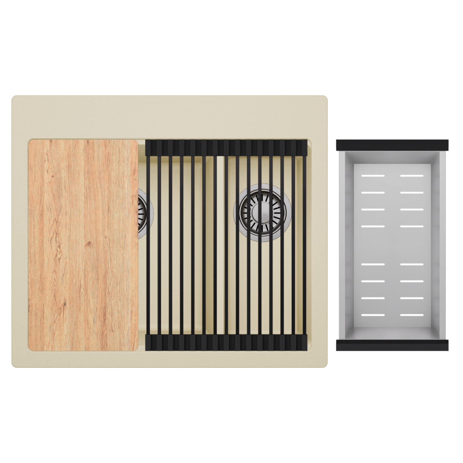 HD Aspen Beige 58 Kétmedencés mosogatótálca szett, vágódeszkával, csepegtetőráccsal és kosárral, soft bézs