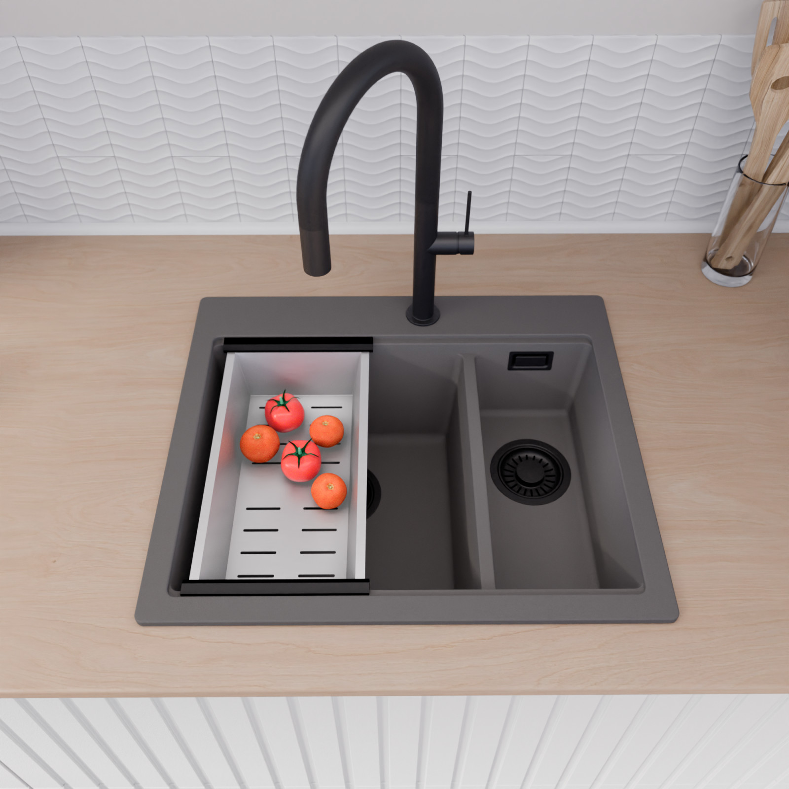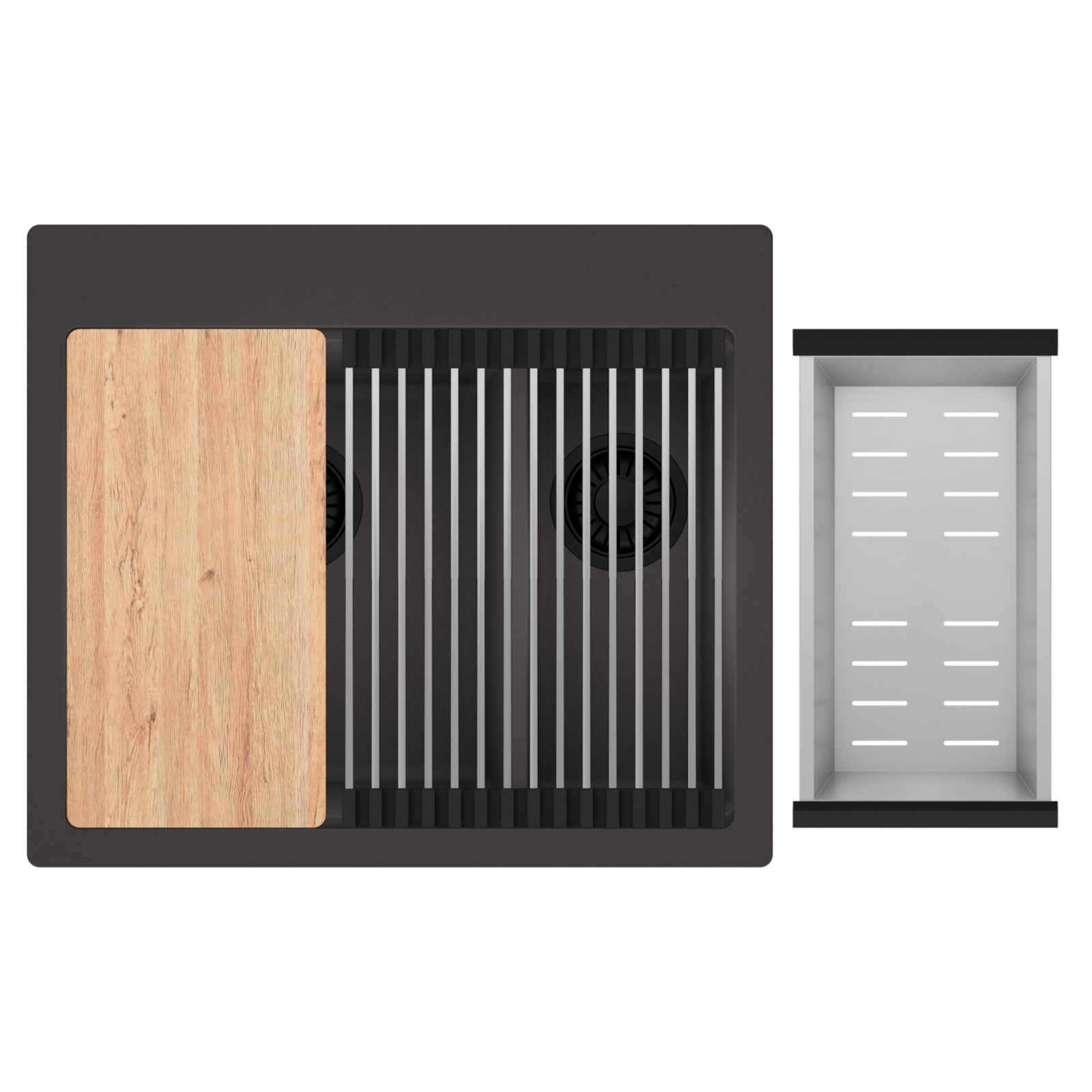 HD Aspen 58 Kétmedencés mosogatótálca szett, vágódeszkával, csepegtetőráccsal és kosárral, matt antracit