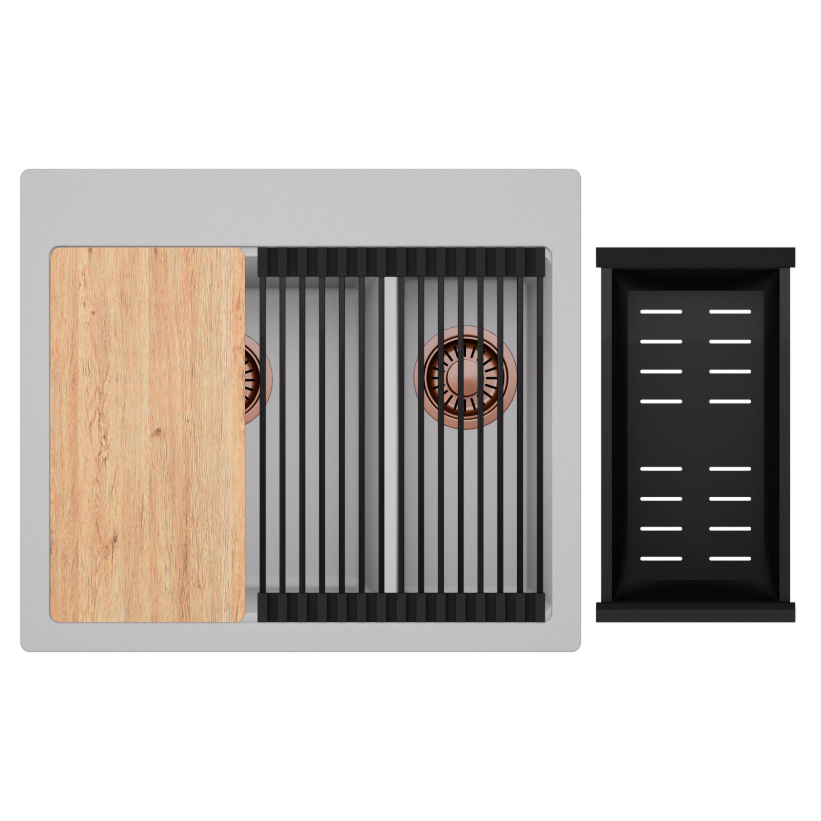HD Aspen Grey 58 Kétmedencés mosogatótálca szett, vágódeszkával, csepegtetőráccsal és kosárral, alpesi szürke