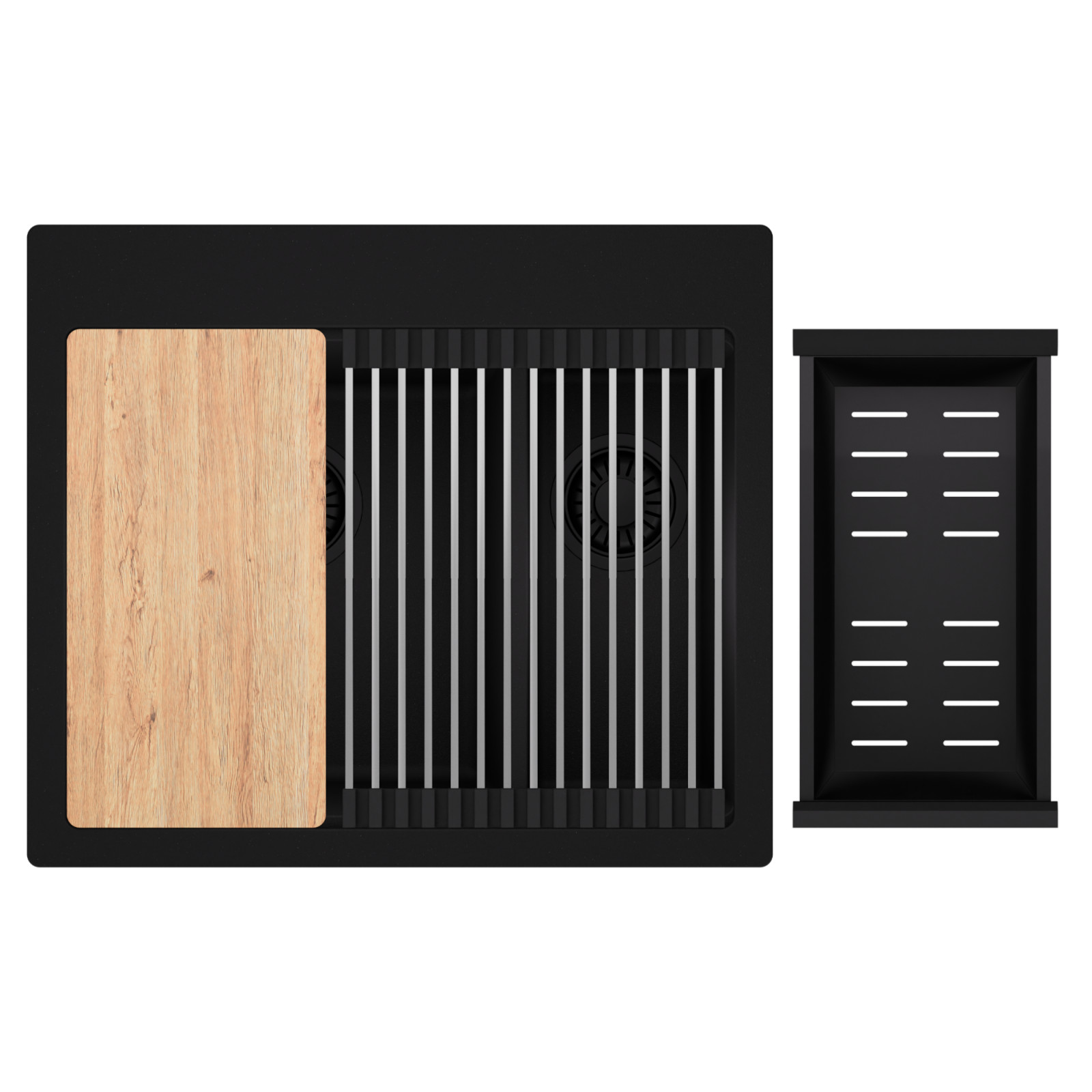 HD Aspen 58 Kétmedencés mosogatótálca szett, vágódeszkával, csepegtetőráccsal és kosárral, matt fekete