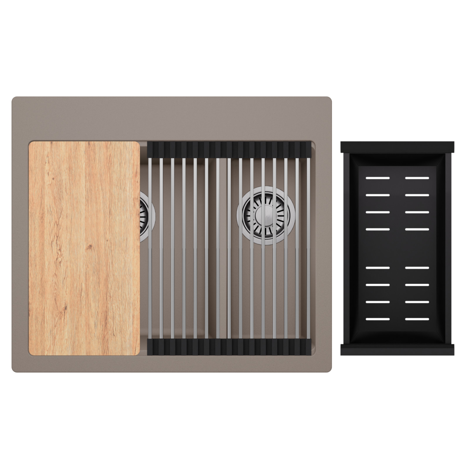 HD Aspen Tortora 58 Kétmedencés mosogatótálca szett, vágódeszkával, csepegtetőráccsal és kosárral, tortora