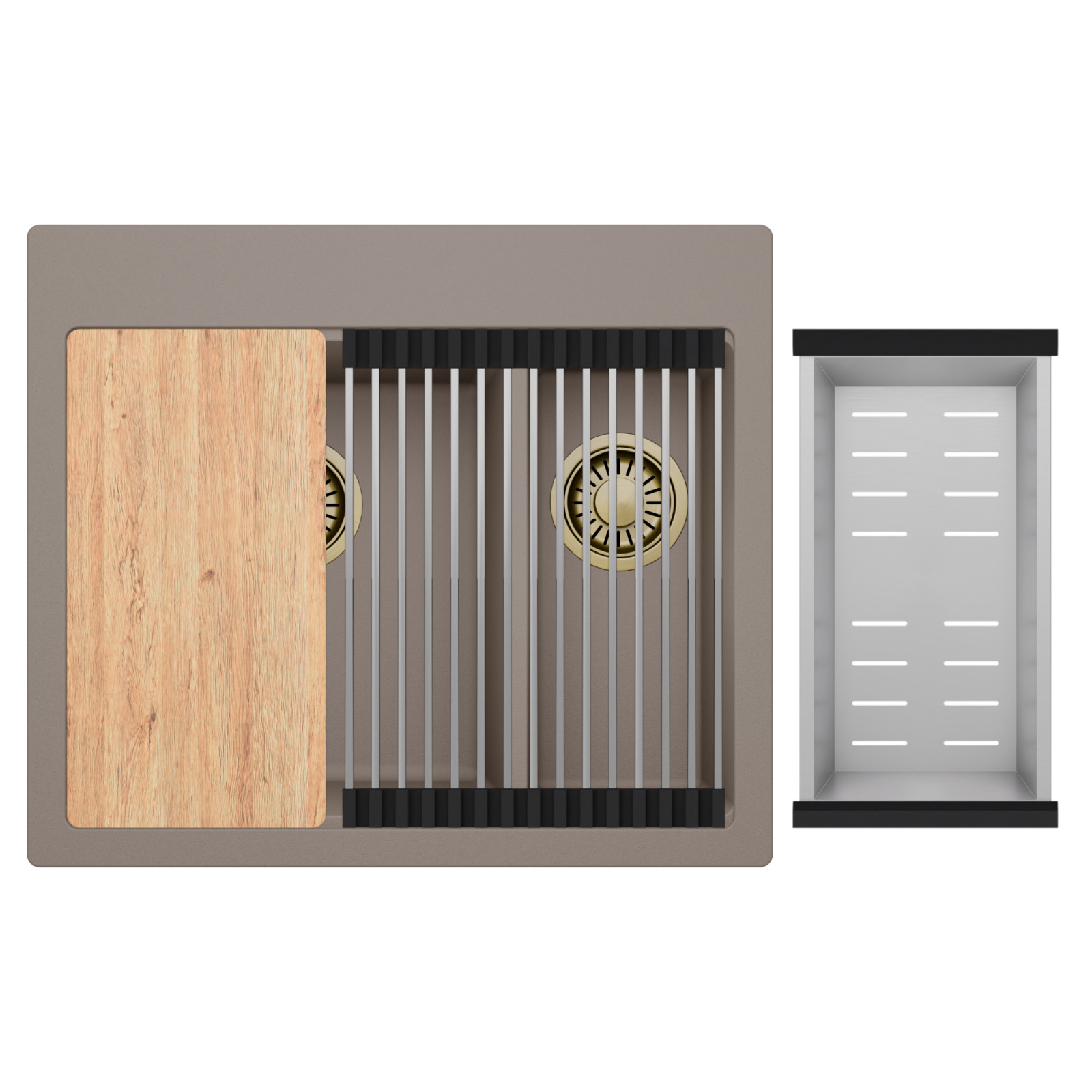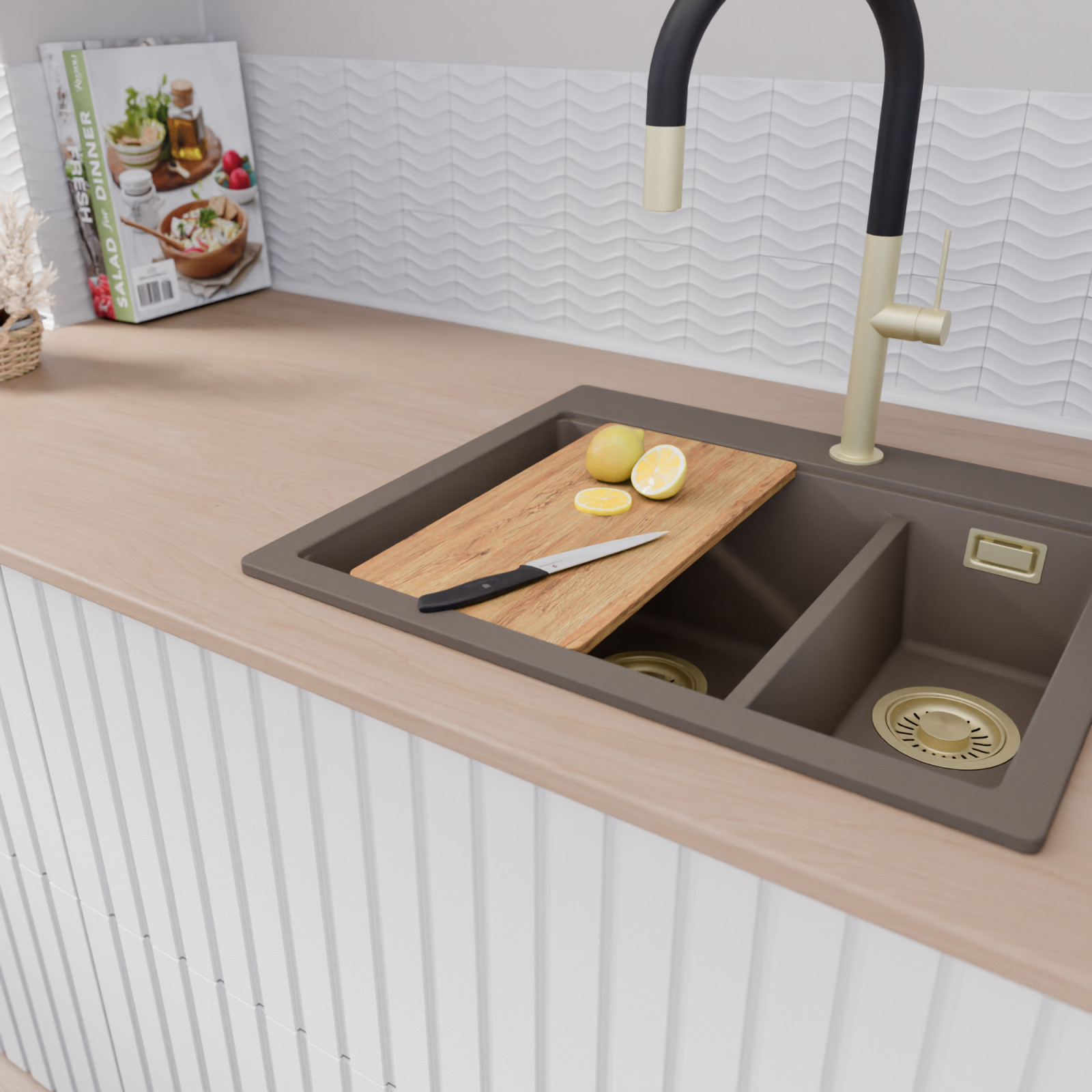 HD Aspen Tortora 58 Kétmedencés mosogatótálca szett, vágódeszkával, csepegtetőráccsal és kosárral, tortora