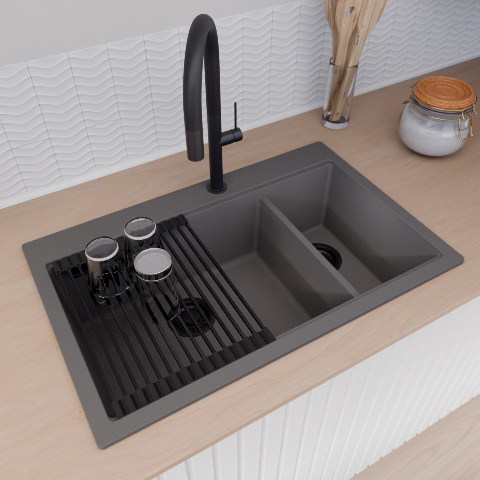 A mosogató prémium minőségű gránit kompozitból készült. Letisztult megjelenése mellett rendkívül praktikus, így bármilyen stílusú konyhába harmonikusan illeszkedik. A strapabíró gránit anyag hosszú távon is megbízható használatot garantál.