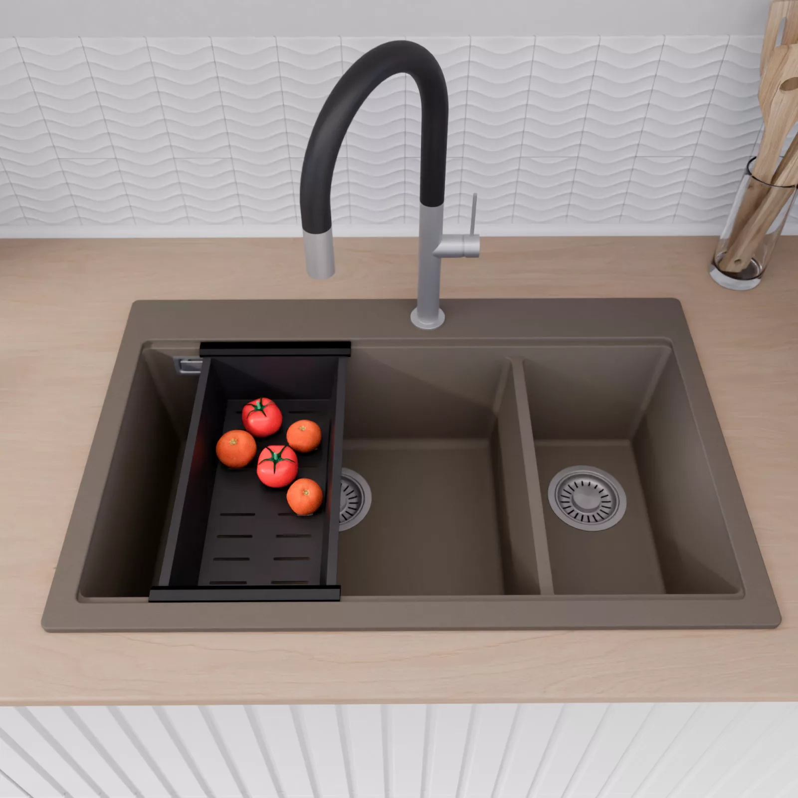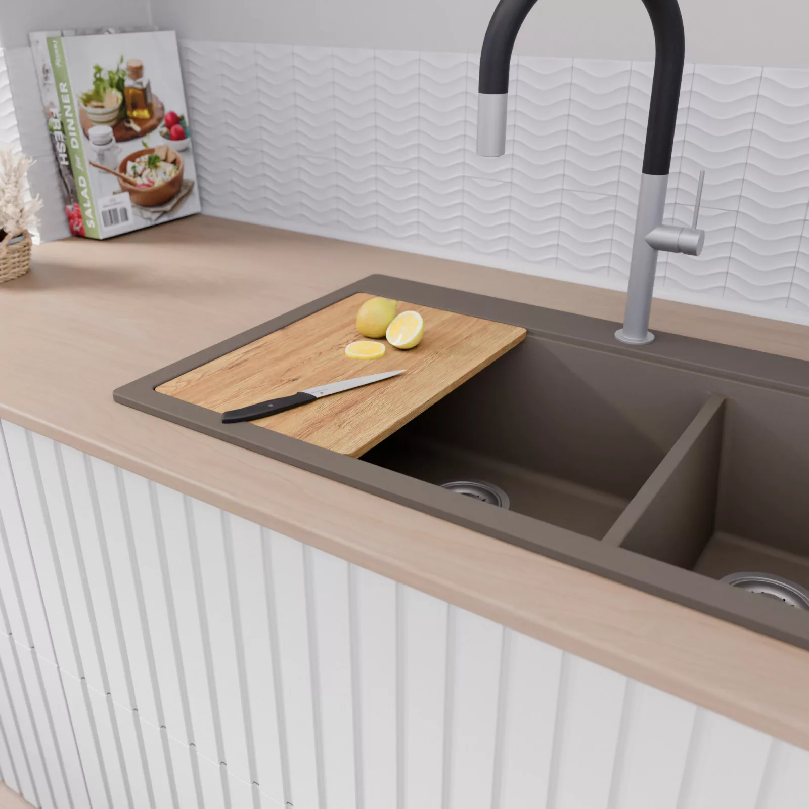 HD Aspen Tortora 78 Kétmedencés mosogatótálca szett, vágódeszkával, csepegtetőráccsal és kosárral, tortora