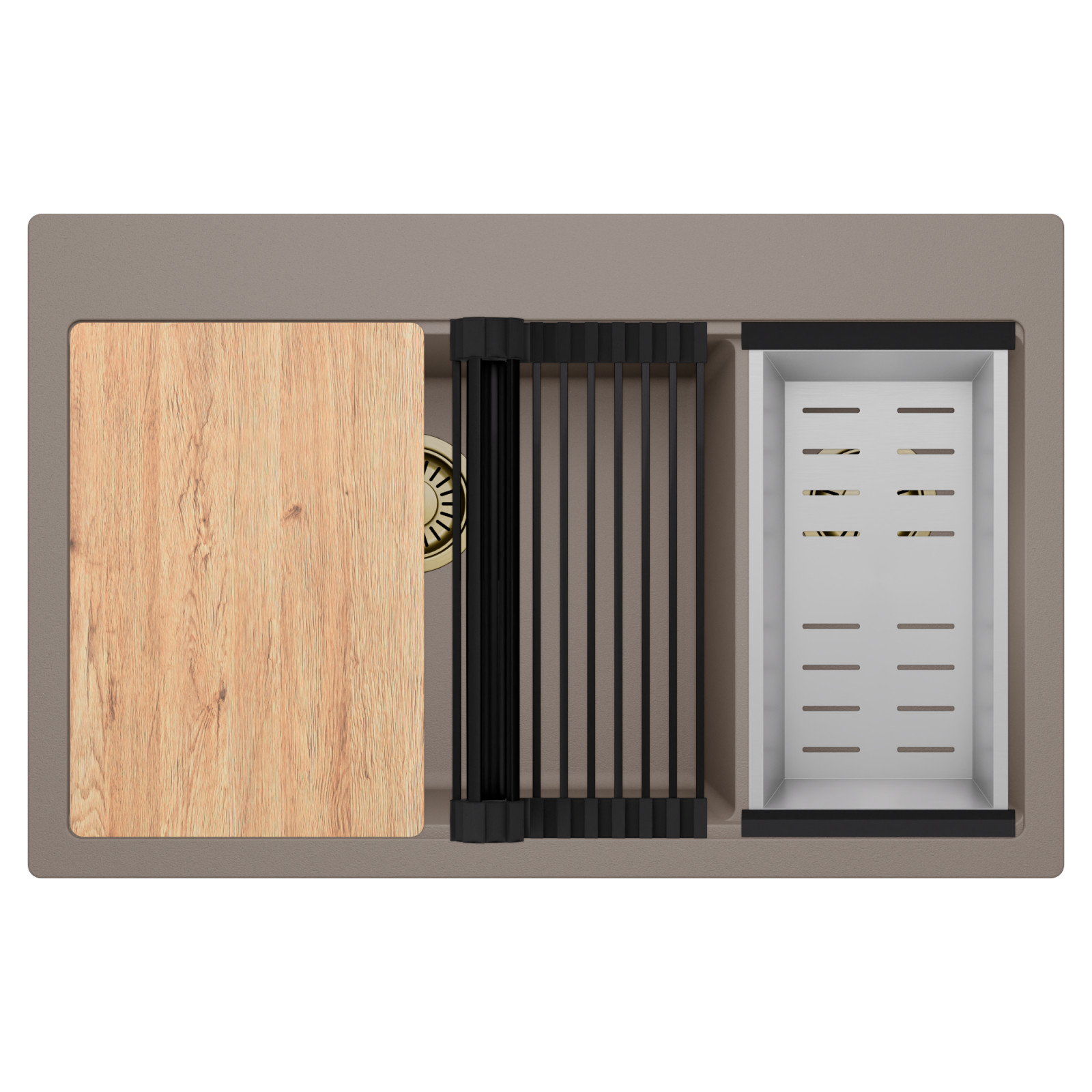 HD Aspen Tortora 78 Kétmedencés mosogatótálca szett, vágódeszkával, csepegtetőráccsal és kosárral, tortora