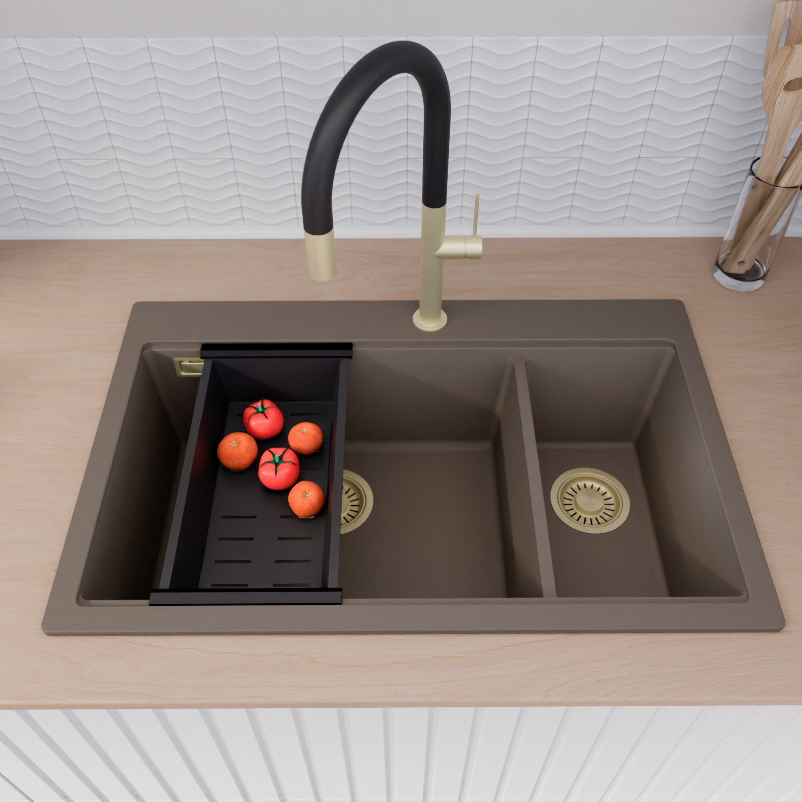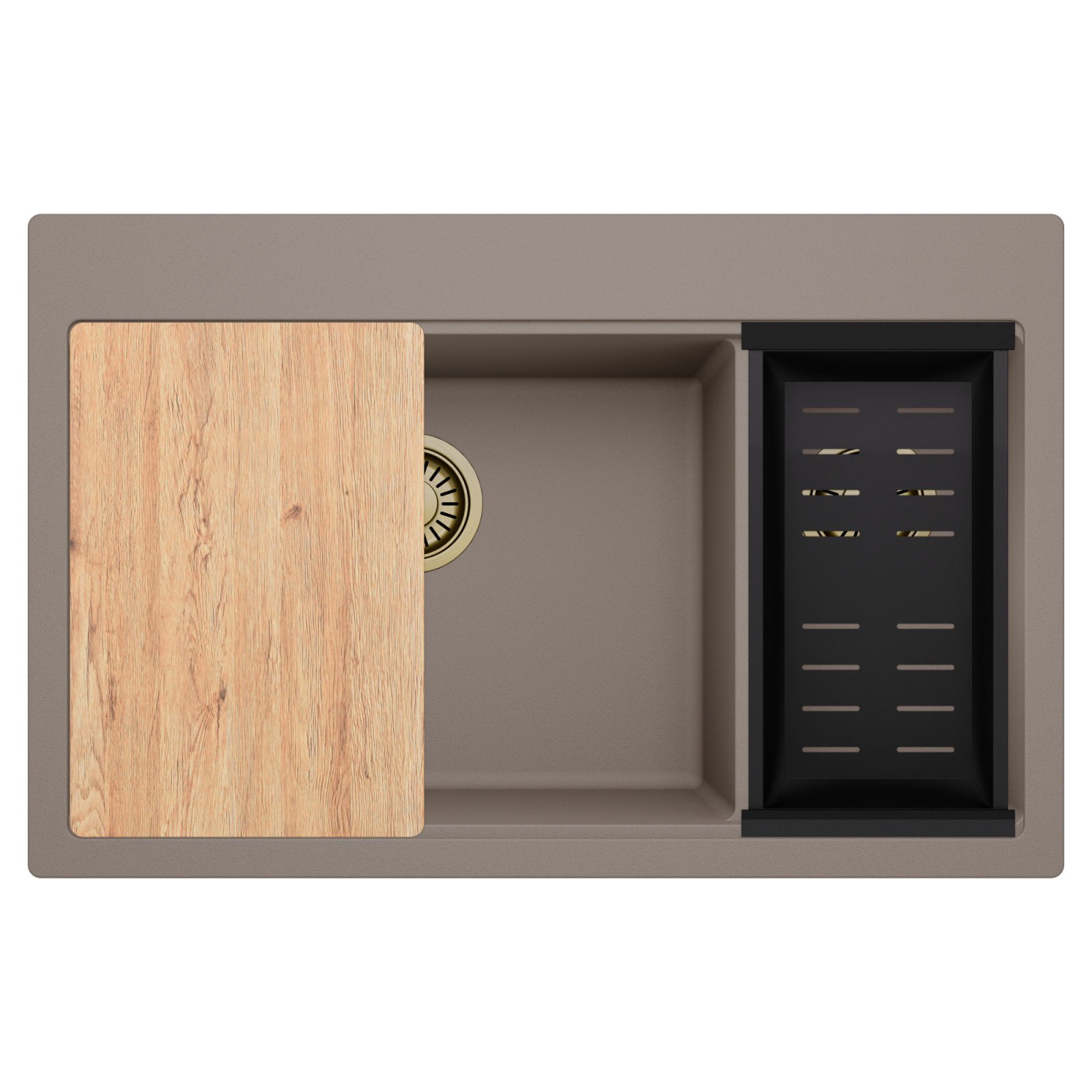 HD Aspen Tortora 78 Kétmedencés mosogatótálca szett, vágódeszkával és csepegtetőkosárral, tortora
