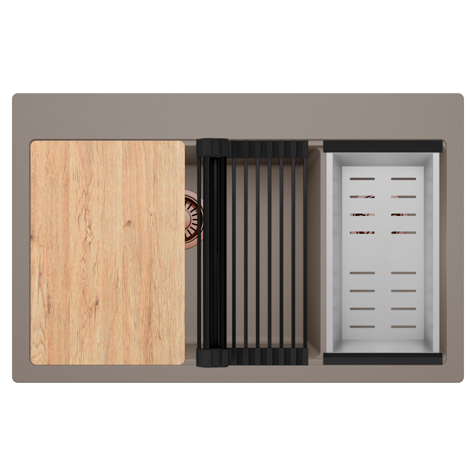 HD Aspen Tortora 78 Kétmedencés mosogatótálca szett, vágódeszkával, csepegtetőráccsal és kosárral, tortora
